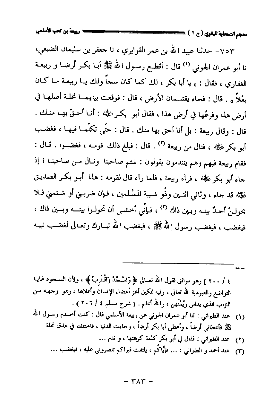 ٧٥٣ - حدثنا عبيد الله بن عمر القواريري نا جعفر بن سليمان الضبعي نا أبو عمران الجوني قال: أقطع رسول الله صلى الله عليه وسلم أبا بكر أرضا وربيعة الغفاري فقال: " ياأبا بكر لك كما كان سجا ولك ياربيعة ما كان بعلا ". قال: فجاء يقتسمان الأرض قال: فوقعت بينهما نخلة أصلها في أرض هذا وفرعها في أرض هذا فقا أبو بكر رضي الله عنه: أنا أحق بها منك. قال: وقال ربيعة: بل أنا أحق بها منك. قال: حتى تكلما فيها فغضب أبو بكر رضي الله عنه فنال من ربيعة. قال: فبلغ ذلك قومه فغضبوا. قال: فقام ربيعة فيهم وهم يتندمون يقولون: شتم صاحبنا ونال من صاحبنا إذ جاء أبو بكر رضي الله عنه فرآه ربيعة فلما رآه قال لقومه: هذا أبو بكر الصديق رضي الله عنه قد جاء وثاني اثنين وذو شيبة المسلمين فإن ضربني أو شتمني فلا يحولن أحد بينه وبين ذاك فإني أخشى أن تحولوا بينه وبين ذاك، فيغضب، فيغضب رسول الله صلى الله عليه وسلم فيغضب الله تبارك وتعالى لغضب نبيه