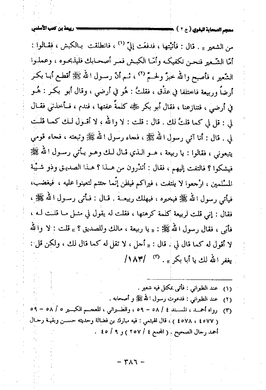 قال: فأتيتها فدفعت إلي فانطلقت بالكبش فقالوا: أما الشعير فنحن نكفيكه وأما الكبش فمر أصحابك فليذبحوه وعملوا الشعير فأصبح والله خبز ولحم ثم أن رسول الله صلى الله عليه وسلم أقطع أبا بكر أرضا وربيعة فاختلفا في عذق فقلت: هو في أرضي وقال أبو بكر: هو في أرضي فتنازعنا فقال أبو بكر رضي الله عنه كلمة عفتها فندم فأخذني فقال لي: قل لي كما قلت لك. قال: قلت: لا والله لا أقول لك كما قلت لي. قال: أنا آتي رسول الله صلى الله عليه وسلم فجاء رسول الله صلى الله عليه وسلم وتبعته فجاء قومي يتبعوني فقالوا: ياربيعة هو الذي قال لك وهو يأتي رسول الله صلى الله عليه وسلم فيشكوا؟ فالتفت إليهم فقال: أتدرون من هذا؟ هذا الصديق وذو شيبة المسلمين ارجعوا لا يلتفت فيراكم فيظن إنما جئتم لتعينوا عليه فيغضب فيأتي رسول الله صلى الله عليه وسلم فيخبره فيهلك ربيعة. قال: فأتى رسول الله صلى الله عليه وسلم فقال: إني قلت لربيعة كلمة كرهتها فقلت له يقول لي مثل ما قلت له فأبى فقال رسول الله صلى الله عليه وسلم: "ياربيعة مالك وللصديق؟ " قلت: لا والله لا أقول له كما قال لي.