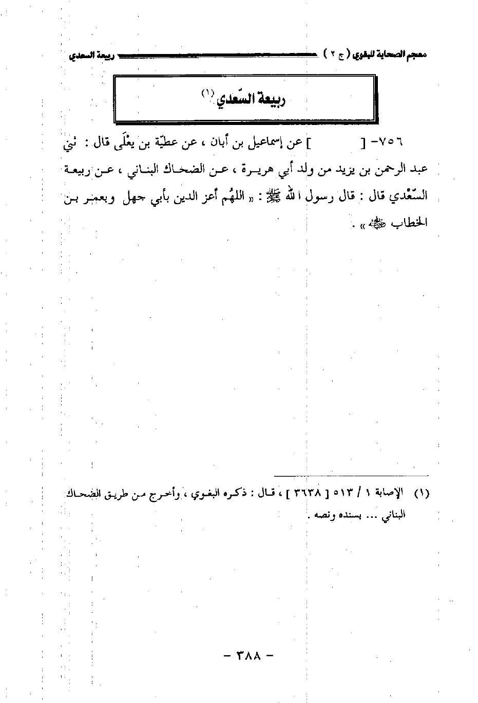 ٧٥٦ - [] عن إسماعيل بن أبان عن عطية بن يعلى قال: حدثني عبد الرحمن بن يزيد من ولد أبي هريرة عن الضحاك البناني عن ربيعة السعدي قال: قال رسول الله صلى الله عليه وسلم: " اللهم أعز الدين بأبي جهل وبعمر بن الخطاب رضي الله عنه.