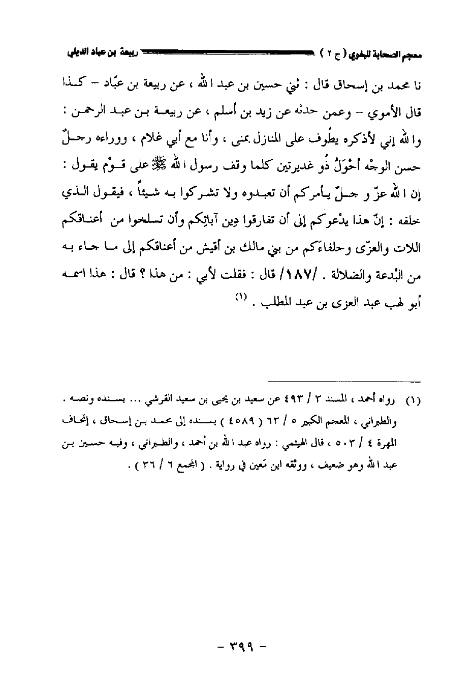 نا محمد بن إسحاق قال حدثني حسين بن عبد الله عن ربيعة بن عباد كذا قال الأموي وعمن حدثه عن زيد بن أسلم عن ربيعة بن عبد الرحمن: والله إني لأذكره يطوف على المنازل بمنى وأنا مع أبي غلام ووراءه رجل حسن الوجه أحول ذو غديرتين كلما وقف رسول الله صلى الله عليه وسلم على قوم يقول: إن الله عز وجل يأمركم ان تعبدوه ولا تشركوا به شيئا فيقول الذي خلفه: إن هذا يدعوكم إلى أن تفارقوا دين آبائكم وأن تسلخوا من أعناقكم إلى ما جاء به من البدعة والضلالة.//١٨٧// قال: فقلت لأبي: من هذا؟ قال: هذا اسمه أبو لهب عبد العزى بن عبد المطلب.