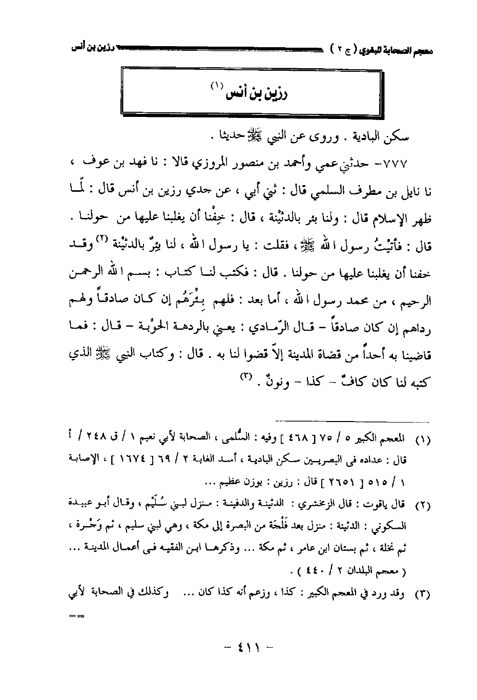 ٧٧٧ - حدثني عمي وأحمد بن منصور المروزي قالا: نا فهد بن عوف نا نايل بن مطرف السلمي قال: ثني أبي عن جدي رزين بن أنس قال: لما ظهر الإسلام قال: ولنا بئر بالدثينة قال: خفنا أن يغلبنا عليها من حولنا. قال: فأتيت رسول الله صلى الله عليه وسلم فقلت: يارسول الله لنا بئر بالدثينة وقد خفنا أن يغلبنا عليها من حولنا. قال: فكتب لنا كتاب: بسم الله الرحمن الرحيم، من محمد رسول الله أما بعد: فلهم بئرهم إن كان صادقا ولهم رداهم إن كان صادقا - قال الرمادي: يعني بالردهة الحوبة قال: فما قاضينا به أحدا من قضاة المدينة إلا قضوا لنا به. قال: وكتاب النبي صلى الله عليه وسلم الذي كتبه لنا كان كاف - كذا - ونون.