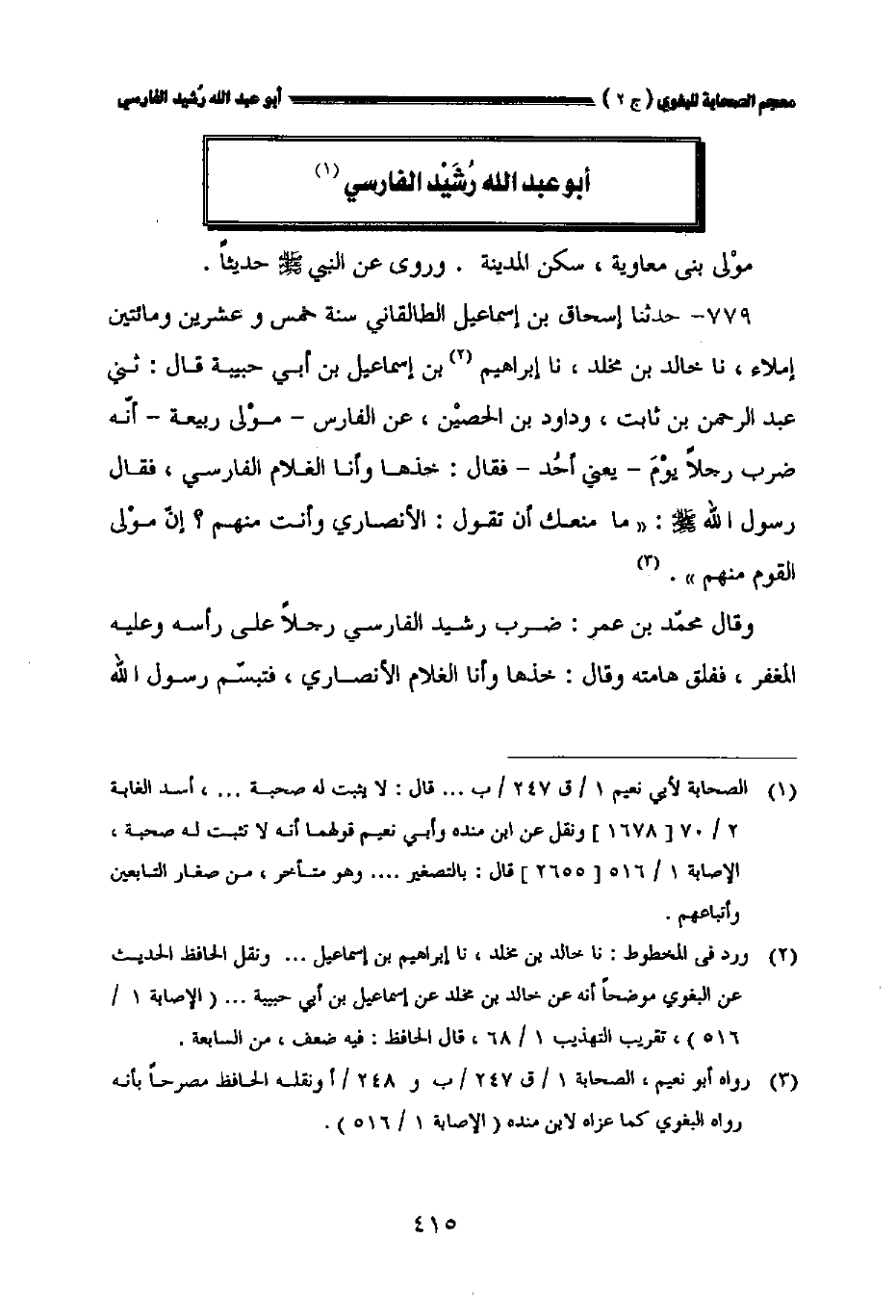 ٧٧٩ - حدثنا إسحاق بن إسماعيل الطالقاني سنة خمس وعشرين ومائتين إملاء نا خالد بن مخلد نا إبراهيم بن إسماعيل بن أبي حبيبة قال: حدثني عبد الرحمن بن ثابت وداود بن الحصين عن الفارس مولى ربيعة أنه ضرب رجلا يوم يعني أحد فقال: خذها وأنا الغلام الفارسي فقال رسول الله صلى الله عليه وسلم: " ما منعك أن تقول: الأنصاري وأنت منهم؟ إن مولى القوم منهم.