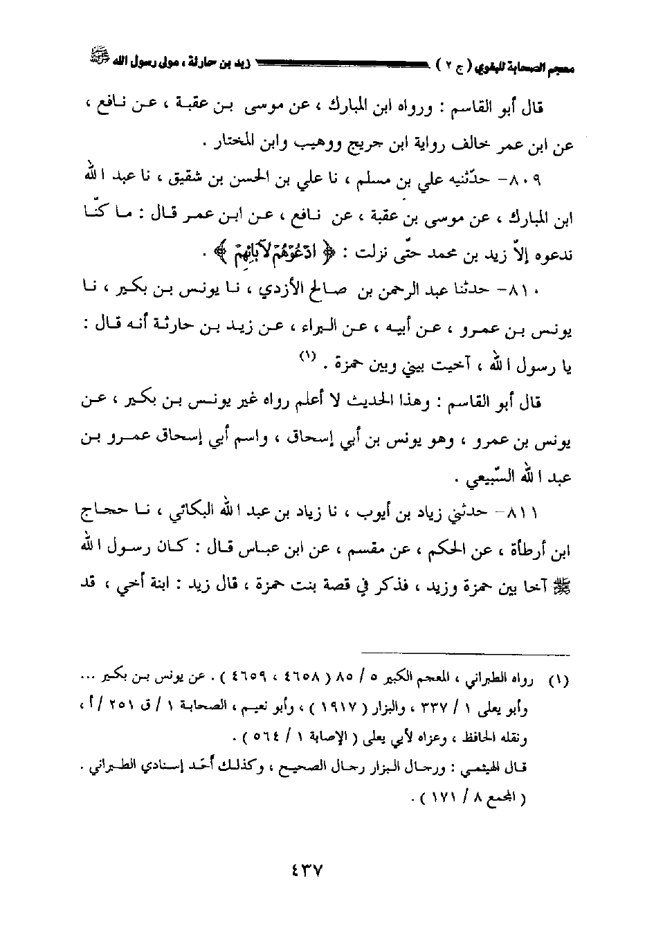 ٨٠٩ - حدثنيه علي بن مسلم نا علي بن الحسن بن شقيق نا عبد الله بن المبارك عن موسى بن عقبة عن نافع عن ابن عمر قال: ما كنا ندعوه إلا زيد بن محمد حتى نزلت {ادعوهم لآبائهم}.
