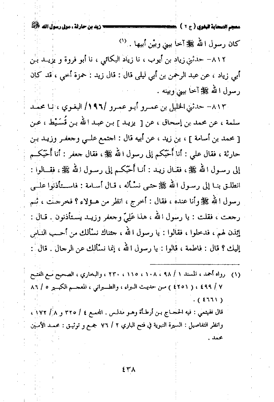 ٨١٣ - حدثني الخليل بن عمرو أبو عمرو//١٩٦// البغوي نا محمد بن سلمة عن محمد بن إسحاق عن [يزيد] بن عبد الله بن قسيط عن [محمد بن أسامة] بن زيد عن أبيه قال: اجتمع علي وجعفر وزيد بن حارثة فقال علي: أنا أحبكم إلى رسول الله صلى الله عليه وسلم، فقال جعفر: أنا أحبكم إلى رسول الله صلى الله عليه وسلم، فقال زيد: أنا أحبكم إلى رسول الله صلى الله عليه وسلم، فقالوا: انطلق بنا إلى رسول الله صلى الله عليه وسلم حتى نسأله قال أسامة: فاستأذنوا على رسول الله صلى الله عليه وسلم وأنا عنده فقال: أخرج انظر من هؤلاء؟ فخرجت ثم رجعت فقلت: يارسول الله هذا علي وجعفر وزيد يستأذنون. قال: ائذن لهم، فدخلوا، فقالوا: يارسول الله جئناك نسألك من أحب الناس إليك؟ قال: فاطمة، قالوا: يارسول الله إنما نسألك عن الرجال. قال: