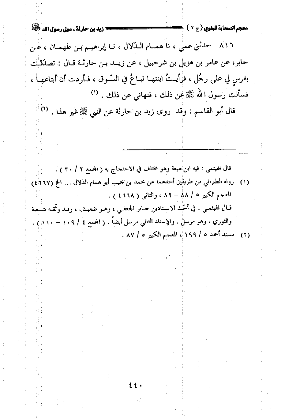 ٨١٦ - حدثني عمي نا همام الدلال نا إبراهيم بن طهمان عن جابر عن عامر بن هزيل بن شرحبيل عن زيد بن حارثة قال: تصدقت بفرس لي على رجل فرأيت ابنتها تباع في السوق فأردت ان أبتاعها فسألت رسول الله صلى الله عليه وسلم عن ذلك فنهاني عن ذلك.