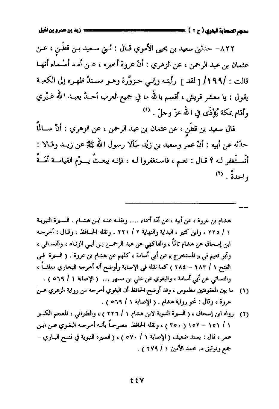 ٨٢٢ - حدثني سعيد بن يحيى الأموي قال: حدثني سعيد بن قطن عن عثمان بن عبد الرحمن عن الزهري: أن عروة أخبره عن أمه أسماء أنها قالت: //١٩٩// [لقد] رأيته وإني حزورة وهو مسند ظهره إلى الكعبة يقول: يامعشر قريش أقسم بالله ما في جميع العرب أحد يعبد الله غيري وأقام بمكة يؤْذَى في الله عز وجل.
