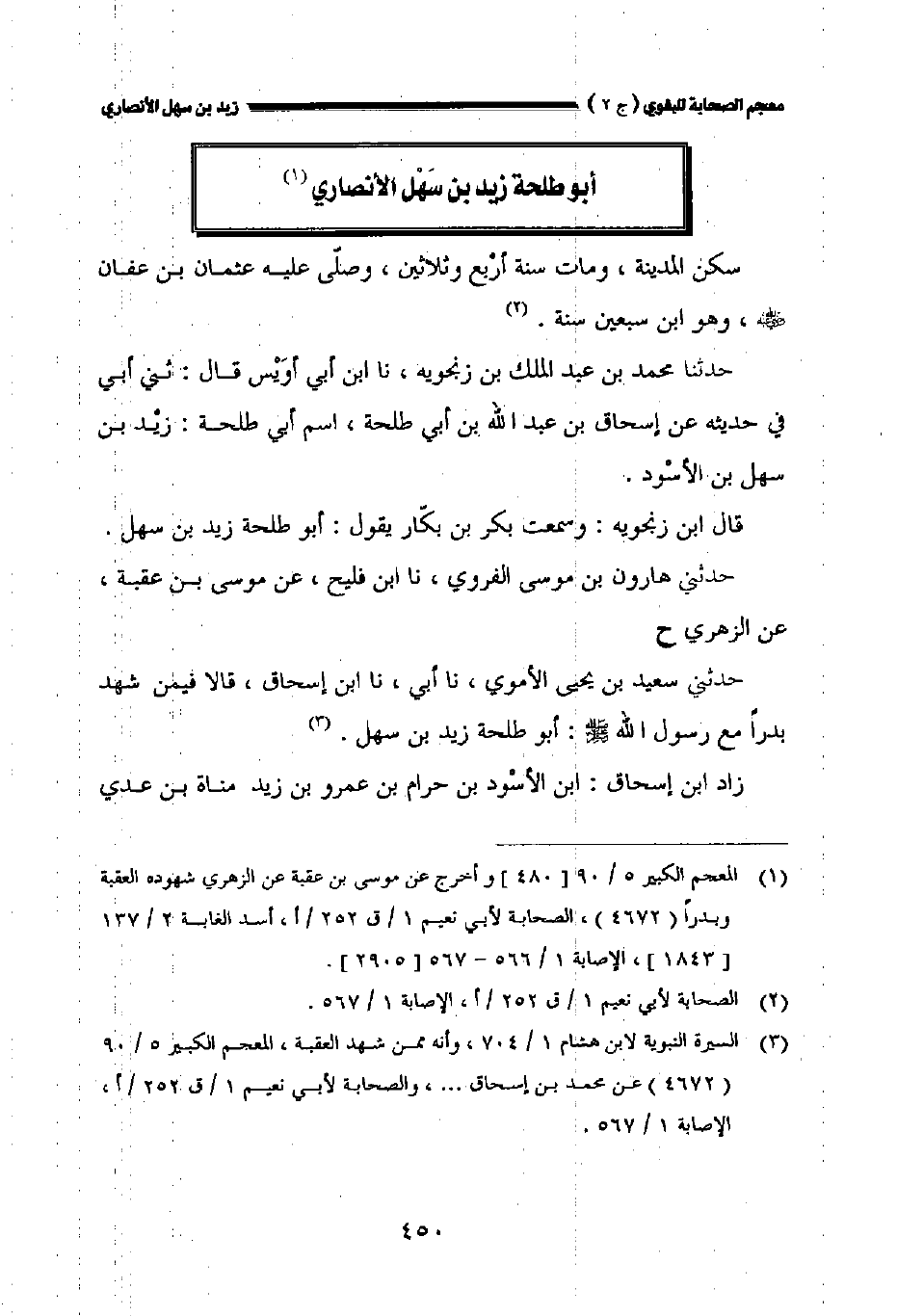 حدثنا محمد بن عبد الملك بن زنجويه نا ابن أبي أويس قال: ثني أبي في حديثه عن إسحاق بن عبد الله بن أبي طلحة اسم أبي طلحة: زيد بن سهل بن الأسود.
