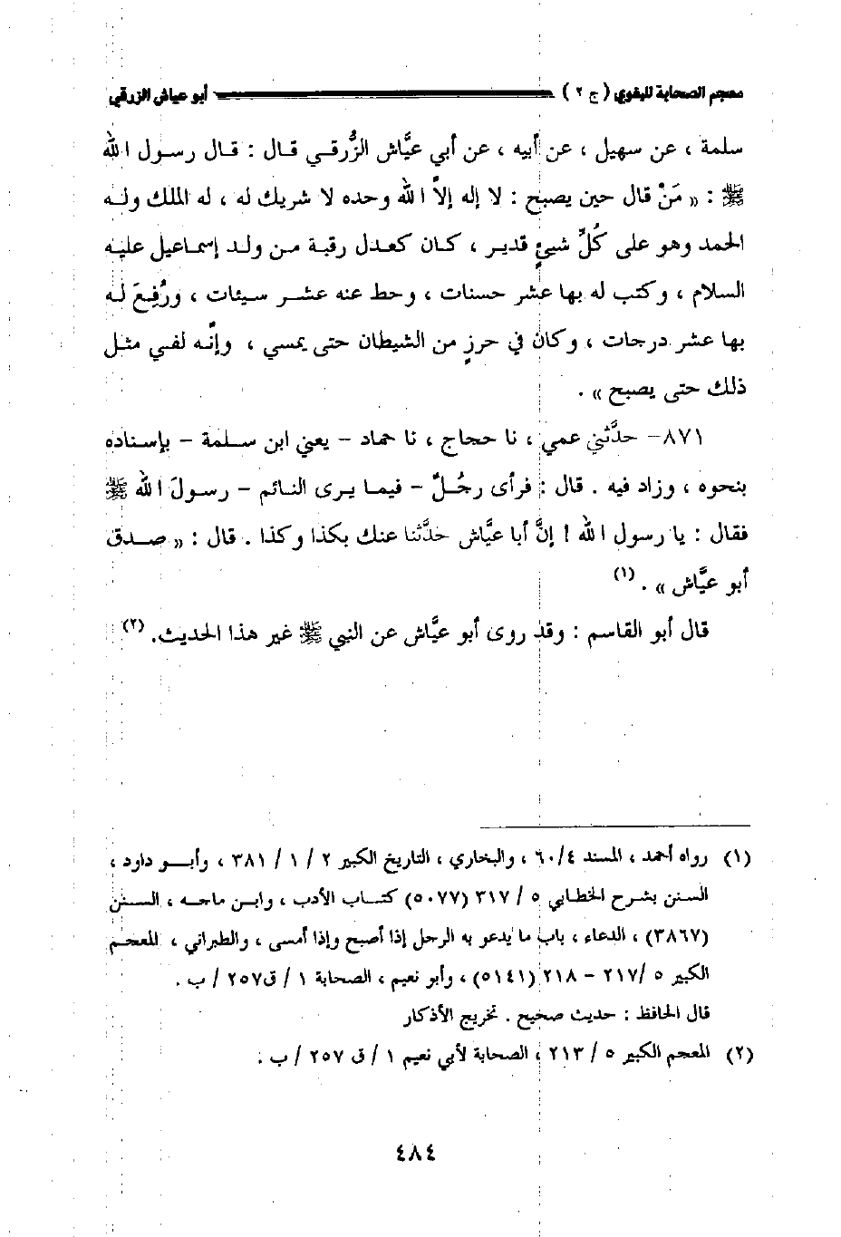 ٨٧١ - حدثني عمي نا حجاج نا حماد يعني ابن سلمة بإسناده بنحوه وزاد فيه. قال: فرأى رجل - فيما يرى النائم - رسول الله صلى الله عليه وسلم فقال: يارسول الله! إن أبا عياش حدثنا عنك بكذا وكذا. قال: " صدق أبو عياش.