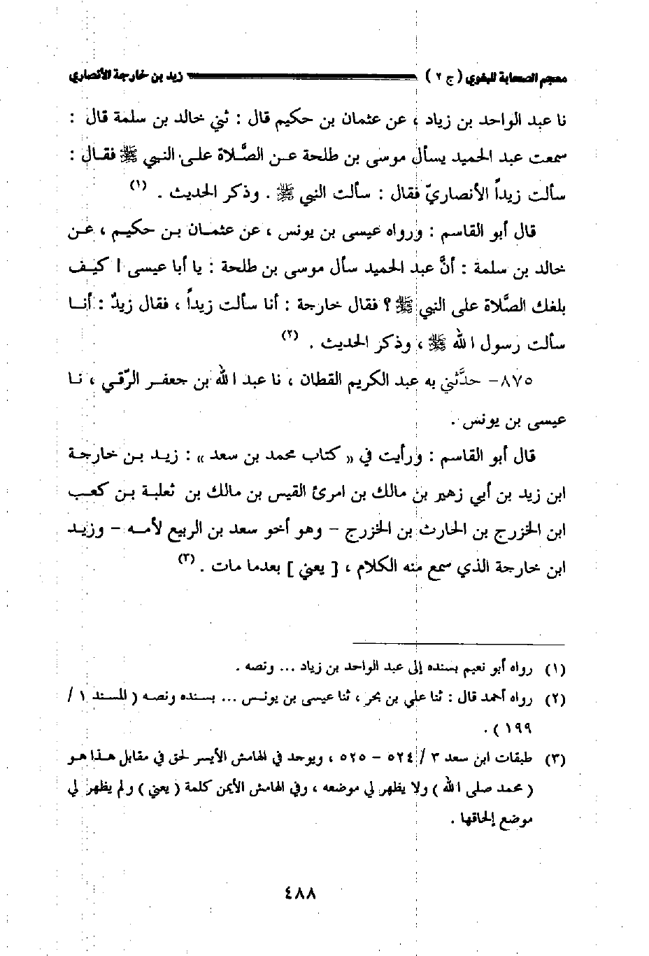 قال أبو القاسم: ورواه عيسى بن يونس عن عثمان بن حكيم عن خالد بن سلمة: أن عبد الحميد سأل موسى بن طلحة: ياأبا عيسى! كيف بلغك الصلاة على النبي صلى الله عليه وسلم؟ فقال خارجة: أنا سألت زيدا فقال زيد: أنا سألت رسول الله صلى الله عليه وسلم وذكر الحديث.