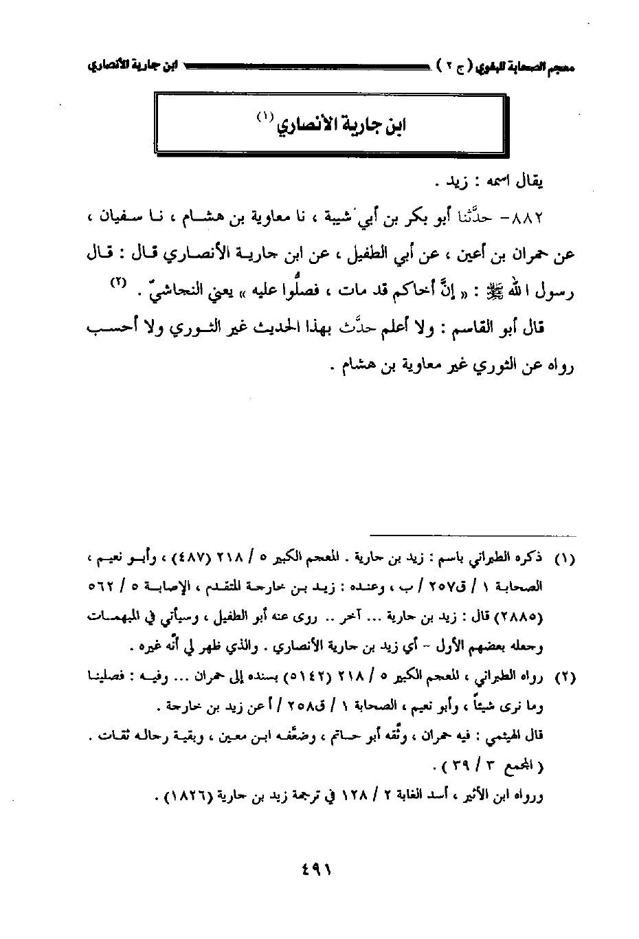 ٨٨٢ - حدثنا أبو بكر بن أبي شيبة نا معاوية بن هشام نا سفيان عن حمران بن أعين عن أبي الطفيل عن ابن جارية الأنصاري قال: قال رسول الله صلى الله عليه وسلم: " إن أخاكم قد مات فصلوا عليه " يعني النجاشي.
