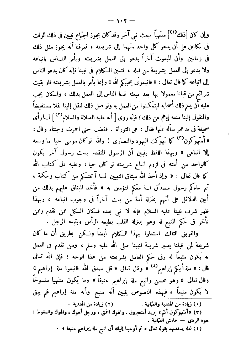 وَإِن كَانَ (ذَلِك) منتهيا ببعث نَبِي آخر وَقد كَانَ يجوز اجْتِمَاع شرائع من قبلنَا مَعْمُولا بهَا بعد مبعثه لدعا النَّاس إِلَى الْعَمَل بذلك ولكان يجب عَلَيْهِ أَن يعلم ذَلِك أَصْحَابه ليتمكنوا من الْعَمَل بِهِ وَلَو فعل ذَلِك لنقل إِلَيْنَا نقلا مستفيضا وَالْمَنْقُول إِلَيْنَا مَنعه إيَّاهُم عَن ذَلِك فَإِنَّهُ رُوِيَ أَنه (عَلَيْهِ الصَّلَاة وَالسَّلَام (لما رأى صحيفَة فِي يَد عمر سَأَلَهُ عَنْهَا فَقَالَ هِيَ التَّوْرَاة