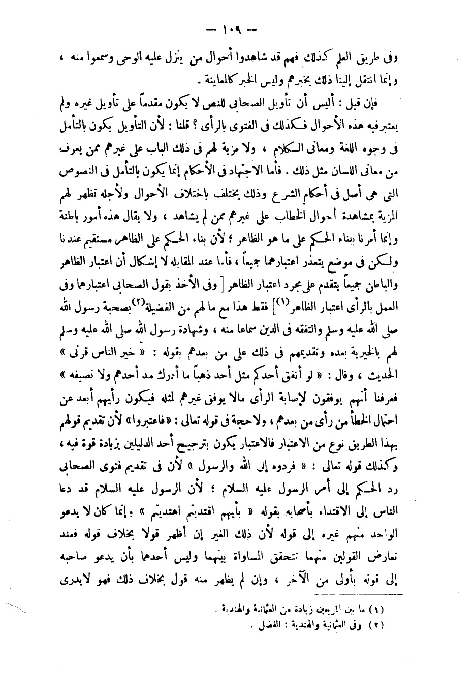 فَأَما الِاجْتِهَاد فِي الْأَحْكَام إِنَّمَا يكون بِالتَّأَمُّلِ فِي النُّصُوص الَّتِي هِيَ أصل فِي أَحْكَام الشَّرْع وَذَلِكَ يخْتَلف باخْتلَاف الْأَحْوَال ولأجله تظهر لَهُم المزية بمشاهدة أَحْوَال الْخطاب على غَيرهم مِمَّن لم يُشَاهد وَلَا يُقَال هَذِه أُمُور باطنة وَإِنَّمَا أمرنَا بِبِنَاء الحكم على مَا هُوَ الظَّاهِر لِأَن بِنَاء الحكم على الظَّاهِر مُسْتَقِيم عندنَا وَلَكِن فِي مَوضِع يتَعَذَّر اعتبارهما جَمِيعًا فَأَما عِنْد الْمُقَابلَة لَا إِشْكَال أَن اعْتِبَار الظَّاهِر وَالْبَاطِن جَمِيعًا يتَقَدَّم على مُجَرّد اعْتِبَار الظَّاهِر (وَفِي الْأَخْذ بقول الصَّحَابِيّ اعتبارهما وَفِي الْعَمَل بِالرَّأْيِ اعْتِبَار الظَّاهِر) فَقَط هَذَا مَعَ مَا لَهُم من الْفَضِيلَة بِصُحْبَة رَسُول الله صلى الله عَلَيْهِ وَسلم والتفقه فِي الدّين سَمَاعا مِنْهُ وَشَهَادَة رَسُول الله صلى الله عَلَيْهِ وَسلم لَهُم بالخيرية بعده وتقديمهم فِي ذَلِك على من بعدهمْ بقوله خير النَّاس قَرْني الحَدِيث وَقَالَ لَو أنْفق أحدكُم مثل أحد ذَهَبا مَا أدْرك مد أحدهم وَلَا نصيفه فَعرفنَا أَنهم يوفقون لإصابة الرَّأْي مَا لَا يوفق غَيرهم لمثله فَيكون رَأْيهمْ أبعد عَن احْتِمَال الْخَطَأ من رَأْي من بعدهمْ وَلَا حجَّة فِي قَوْله تَعَالَى {فاعتبروا} لِأَن تَقْدِيم قَوْلهم بِهَذَا الطَّرِيق نوع من الِاعْتِبَار فالاعتبار يكون بترجيح أحد الدَّلِيلَيْنِ بِزِيَادَة قُوَّة فِيهِ وَكَذَلِكَ قَوْله تَعَالَى {فَردُّوهُ إِلَى الله وَالرَّسُول} لِأَن فِي تَقْدِيم فَتْوَى الصَّحَابِيّ رد الحكم إِلَى أَمر الرَّسُول عَلَيْهِ السَّلَام لِأَن الرَّسُول عَلَيْهِ السَّلَام قد دَعَا النَّاس إِلَى الِاقْتِدَاء بِأَصْحَابِهِ بقوله بِأَيِّهِمْ اقْتَدَيْتُمْ اهْتَدَيْتُمْ وَإِنَّمَا كَانَ لَا يَدْعُو الْوَاحِد مِنْهُم غَيره إِلَى قَوْله لِأَن ذَلِك الْغَيْر إِن أظهر قولا بِخِلَاف قَوْله فَعِنْدَ تعَارض الْقَوْلَيْنِ مِنْهُمَا تتَحَقَّق الْمُسَاوَاة بَينهمَا وَلَيْسَ أَحدهمَا بِأَن يَدْعُو صَاحبه إِلَى قَوْله بِأولى من الآخر وَإِن لم يظْهر مِنْهُ قَول بِخِلَاف ذَلِك فَهُوَ لَا يدْرِي