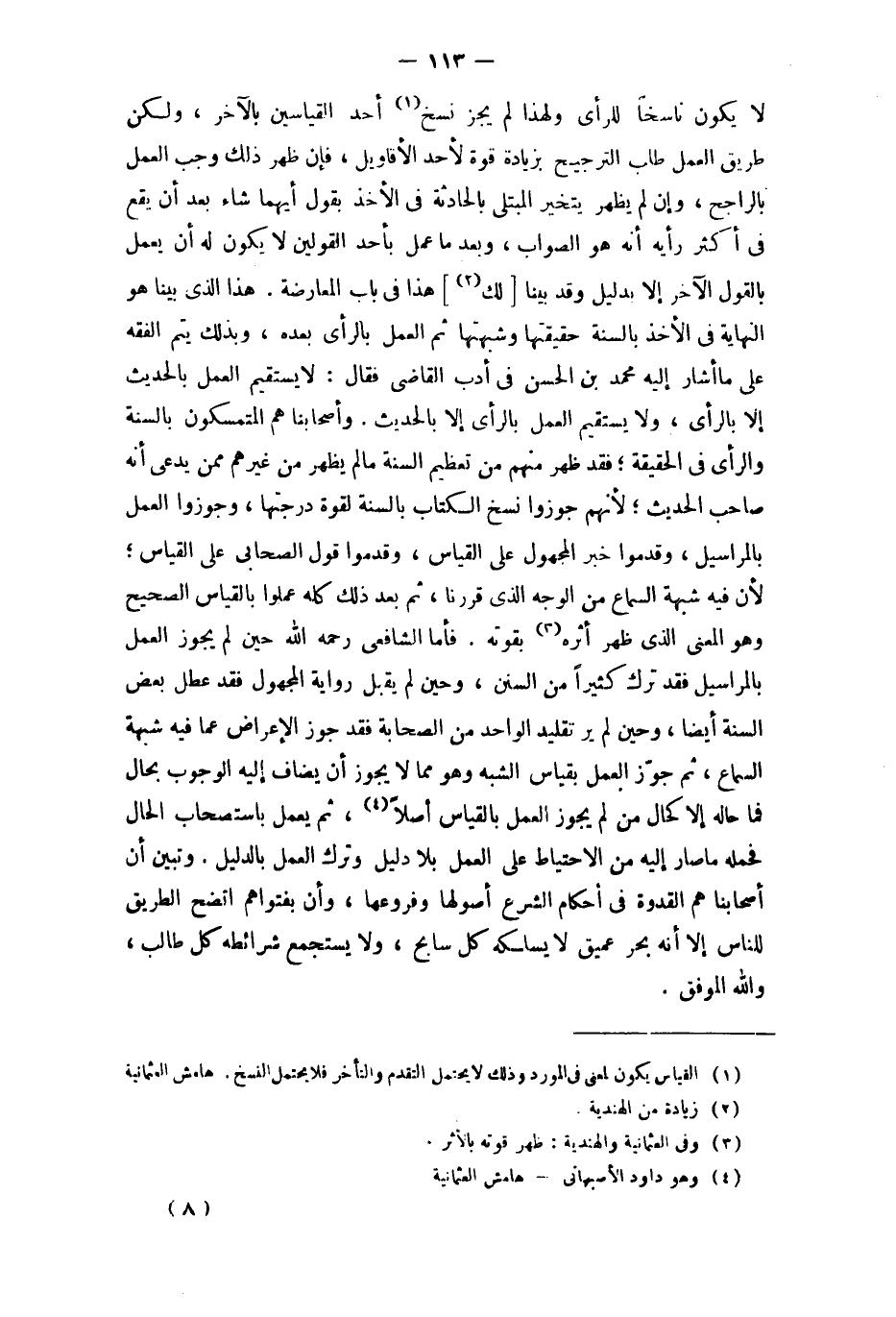 هَذَا الَّذِي بَينا هُوَ النِّهَايَة فِي الْأَخْذ بِالسنةِ حَقِيقَتهَا وشبهتها ثمَّ الْعَمَل بِالرَّأْيِ بعده وَبِذَلِك يتم الْفِقْه على مَا أَشَارَ إِلَيْهِ مُحَمَّد بن الْحسن فِي أدب القَاضِي فَقَالَ لَا يَسْتَقِيم الْعَمَل بِالْحَدِيثِ إِلَّا بِالرَّأْيِ وَلَا يَسْتَقِيم الْعَمَل بِالرَّأْيِ إِلَّا بِالْحَدِيثِ