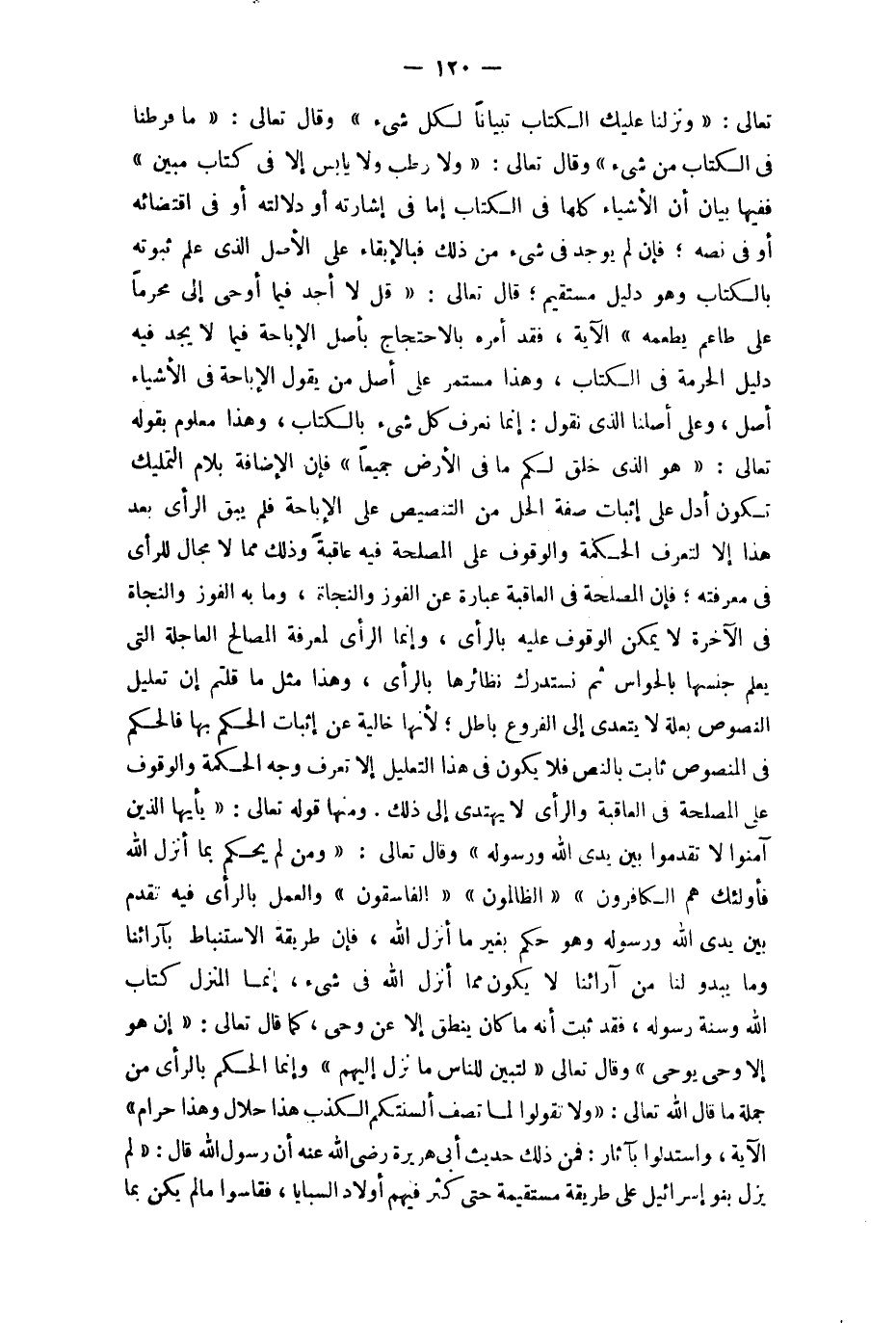وَقَالَ تَعَالَى {مَا فرطنا فِي الْكتاب من شَيْء} وَقَالَ تَعَالَى {وَلَا رطب وَلَا يَابِس إِلَّا فِي كتاب مُبين} فَفِيهَا بَيَان أَن الْأَشْيَاء كلهَا فِي الْكتاب إِمَّا فِي إِشَارَته أَو دلَالَته أَو فِي اقتضائه أَو فِي نَصه فَإِن لم يُوجد فِي شَيْء من ذَلِك فبالإبقاء على الأَصْل الَّذِي علم ثُبُوته بِالْكتاب وَهُوَ دَلِيل مُسْتَقِيم قَالَ تَعَالَى {قل لَا أجد فِيمَا أُوحِي إِلَيّ محرما على طاعم يطعمهُ} الْآيَة فقد أمره بالاحتجاج بِأَصْل الْإِبَاحَة فِيمَا لَا يجد فِيهِ دَلِيل الْحُرْمَة فِي الْكتاب وَهَذَا مُسْتَمر على أصل من يَقُول الْإِبَاحَة فِي الْأَشْيَاء أصل وعَلى أصلنَا الَّذِي نقُول إِنَّمَا نَعْرِف كل شَيْء بِالْكتاب وَهَذَا مَعْلُوم بقوله تَعَالَى {هُوَ الَّذِي خلق لكم مَا فِي الأَرْض جَمِيعًا} فَإِن الْإِضَافَة بلام التَّمْلِيك تكون أدل على إِثْبَات صفة الْحل من التَّنْصِيص على الْإِبَاحَة فَلم يبْق الرَّأْي بعد هَذَا إِلَّا لتعرف الْحِكْمَة وَالْوُقُوف على الْمصلحَة فِيهِ عَاقِبَة وَذَلِكَ مِمَّا لَا مجَال للرأي فِي مَعْرفَته فَإِن الْمصلحَة فِي الْعَاقِبَة عبارَة عَن الْفَوْز والنجاة وَمَا بِهِ الْفَوْز والنجاة فِي الْآخِرَة لَا يُمكن الْوُقُوف عَلَيْهِ بِالرَّأْيِ وَإِنَّمَا الرَّأْي لمعْرِفَة الْمصَالح العاجلة الَّتِي يعلم جِنْسهَا بالحواس ثمَّ نستدرك نظائرها بِالرَّأْيِ وَهَذَا مثل مَا قُلْتُمْ إِن تَعْلِيل النُّصُوص بعلة لَا يتَعَدَّى إِلَى الْفُرُوع بَاطِل لِأَنَّهَا خَالِيَة عَن إِثْبَات الحكم بهَا فَالْحكم فِي الْمَنْصُوص ثَابت بِالنَّصِّ فَلَا يكون فِي هَذَا التَّعْلِيل إِلَّا تعرف وَجه الْحِكْمَة وَالْوُقُوف على الْمصلحَة فِي الْعَاقِبَة والرأي لَا يَهْتَدِي إِلَى ذَلِك