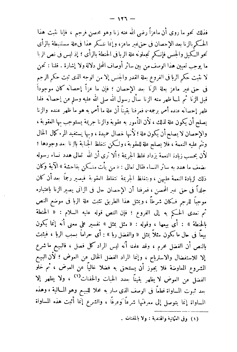 قُلْنَا نَحن لَا نثبت حكم الرِّبَا فِي الْفُرُوع بعلة الْقدر وَالْجِنْس إِلَّا من الْوَجْه الَّذِي ثَبت حكم الرَّجْم فِي حق غير مَاعِز بعلة الزِّنَا بعد الْإِحْصَان فَإِن ماعزا إحْصَانه كَانَ مَوْجُودا قبل الزِّنَا ثمَّ لما ظهر مِنْهُ الزِّنَا سَأَلَ رَسُول الله صلى الله عَلَيْهِ وَسلم عَن إحْصَانه فَلَمَّا ظهر إحْصَانه عِنْده أَمر برجمه فَعرفنَا يَقِينا أَن عِلّة مَا أَمر بِهِ هُوَ مَا ظهر عِنْده وَالزِّنَا يصلح أَن يكون عِلّة لذَلِك لِأَن الْمَأْمُور بِهِ عُقُوبَة وَالزِّنَا جريمة يسْتَوْجب بهَا الْعقُوبَة والإحصان لَا يصلح أَن يكون عِلّة لِأَنَّهَا خِصَال حميدة وَبهَا يَسْتَفِيد الْمَرْء كَمَال الْحَال وتتم عَلَيْهِ النِّعْمَة فَلَا يصلح عِلّة للعقوبة وَلَكِن تتغلظ الْجِنَايَة بِالزِّنَا بعد وجودهَا لِأَن بِحَسب زِيَادَة النِّعْمَة يزْدَاد غلظ الجريمة أَلا ترى أَن الله تَعَالَى هدد نسَاء رَسُوله بِضعْف مَا هدد بِهِ سَائِر النِّسَاء فَقَالَ تَعَالَى {من يَأْتِ مِنْكُن بِفَاحِشَة} الْآيَة وَكَانَ ذَلِك لزِيَادَة النِّعْمَة عَلَيْهِنَّ وبتغلظ الجريمة تتغلظ الْعقُوبَة فَيصير رجما بعد أَن كَانَ جلدا فِي حق غير الْمُحصن فَعرفنَا أَن الْإِحْصَان حَال فِي الزَّانِي يصير الزِّنَا بِاعْتِبَارِهِ مُوجبا للرجم فَكَانَ شرطا وبمثل هَذَا الطَّرِيق تثبت عِلّة الرِّبَا فِي مَوضِع النَّص ثمَّ تعدى الحكم بِهِ إِلَى الْفُرُوع فَإِن النَّص قَوْله عَلَيْهِ السَّلَام الْحِنْطَة بِالْحِنْطَةِ أَي بيعهَا وَقَوله مثل بِمثل تَفْسِير على معنى أَنه إِنَّمَا يكون بيعا فِي حَال مَا يكون مثلا بِمثل (وَالْفضل رَبًّا) أَي حَرَامًا بِسَبَب الرِّبَا فَيثبت بِالنَّصِّ أَن الْفضل محرم وَقد علمنَا أَنه لَيْسَ المُرَاد كل فصل فَالْبيع مَا شرع إِلَّا للاستفضال والاسترباح وَإِنَّمَا المُرَاد الْفضل الْخَالِي عَن الْعِوَض لِأَن البيع الْمَشْرُوع الْمُعَاوضَة فَلَا يجوز أَن يسْتَحق بِهِ فضلا خَالِيا عَن الْعِوَض ثمَّ خلو الْفضل عَن الْعِوَض لَا يظْهر يَقِينا بِعَدَد الحبات والحفنات وَلَا يظْهر إِلَّا بعد ثُبُوت الْمُسَاوَاة قطعا فِي الْوَصْف الَّذِي صَار بِهِ محلا للْبيع وَهُوَ الْمَالِيَّة وَهَذِه الْمُسَاوَاة إِنَّمَا يتَوَصَّل إِلَى مَعْرفَتهَا شرعا وَعرفا وَالشَّرْع إِنَّمَا أثبت هَذِه الْمُسَاوَاة