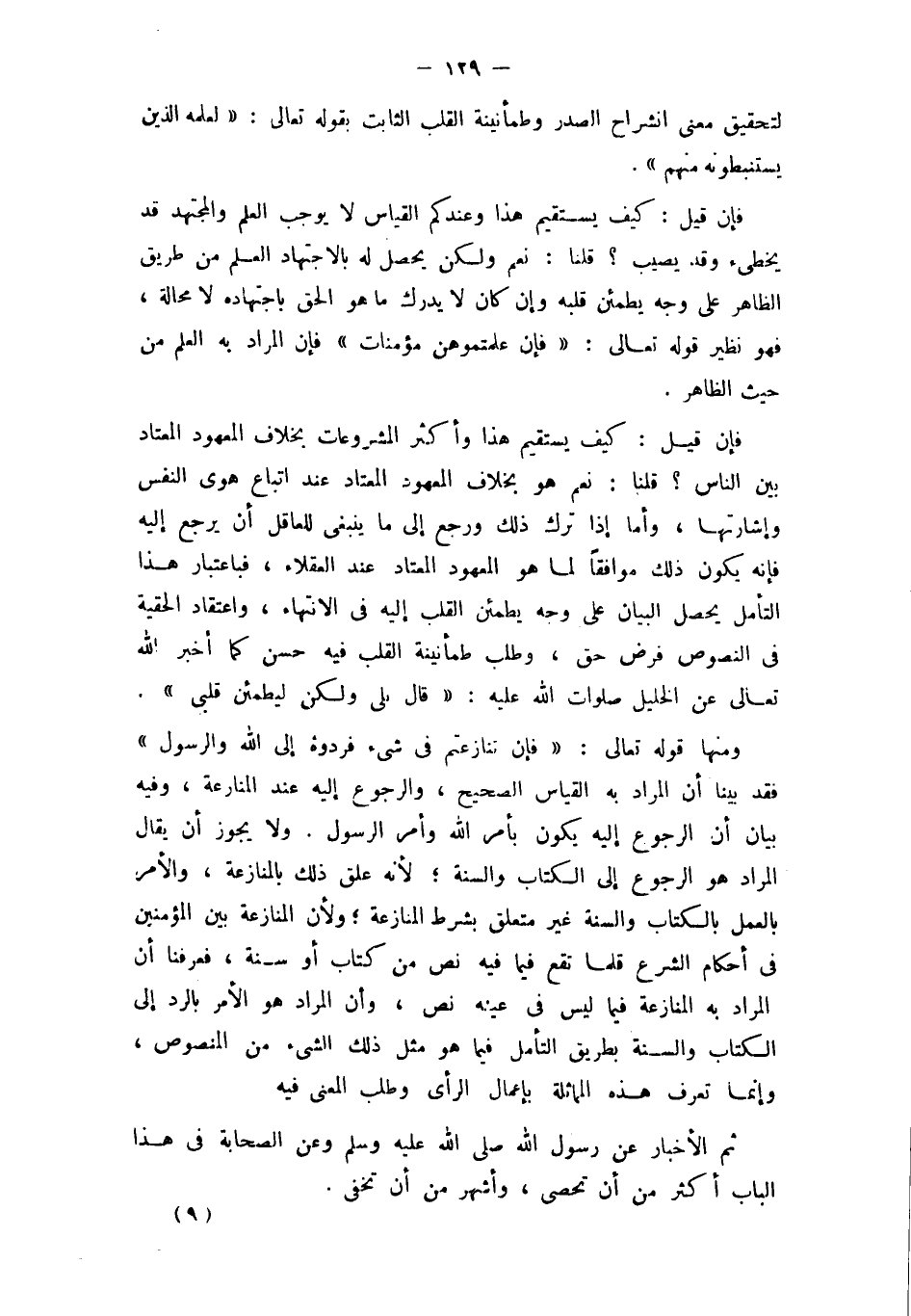 وَمِنْهَا قَوْله تَعَالَى {فَإِن تنازعتم فِي شَيْء فَردُّوهُ إِلَى الله وَالرَّسُول} فقد بَينا أَن المُرَاد بِهِ الْقيَاس الصَّحِيح وَالرُّجُوع إِلَيْهِ عِنْد الْمُنَازعَة وَفِيه بَيَان أَن الرُّجُوع إِلَيْهِ يكون بِأَمْر الله وَأمر الرَّسُول