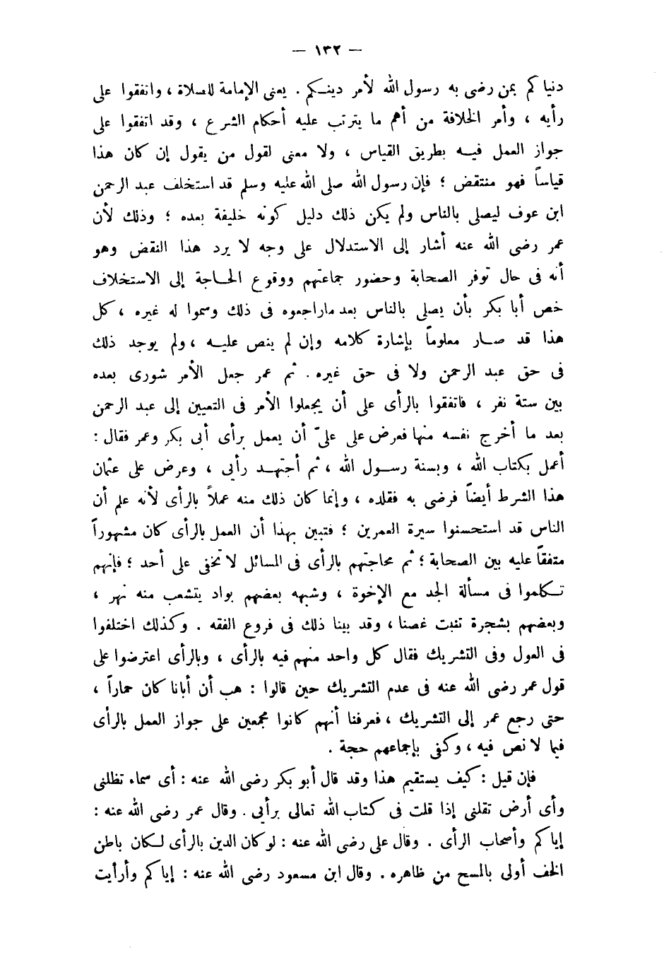 ثمَّ عمر جعل الْأَمر شُورَى بعده بَين سِتَّة نفر فاتفقوا بِالرَّأْيِ على أَن يجْعَلُوا الْأَمر فِي التَّعْيِين إِلَى عبد الرَّحْمَن بَعْدَمَا أخرج نَفسه مِنْهَا فَعرض على عَليّ أَن يعْمل بِرَأْي أَبى بكر وَعمر فَقَالَ أعمل بِكِتَاب الله وبسنة رَسُول الله ثمَّ أجتهد رَأْيِي وَعرض على عُثْمَان هَذَا الشَّرْط أَيْضا فَرضِي بِهِ فقلده وَإِنَّمَا كَانَ ذَلِك مِنْهُ عملا بِالرَّأْيِ لِأَنَّهُ علم أَن النَّاس قد استحسنوا سيرة العمرين فَتبين بِهَذَا أَن الْعَمَل بِالرَّأْيِ كَانَ مَشْهُورا مُتَّفقا عَلَيْهِ بَين الصَّحَابَة ثمَّ محاجتهم بِالرَّأْيِ فِي الْمسَائِل لَا تخفى على أحد فَإِنَّهُم تكلمُوا فِي مَسْأَلَة الْجد مَعَ الْإِخْوَة وَشبهه بَعضهم بواد يتشعب مِنْهُ نهر وَبَعْضهمْ بشجرة تنْبت غصنا وَقد بَينا ذَلِك فِي فروع الْفِقْه