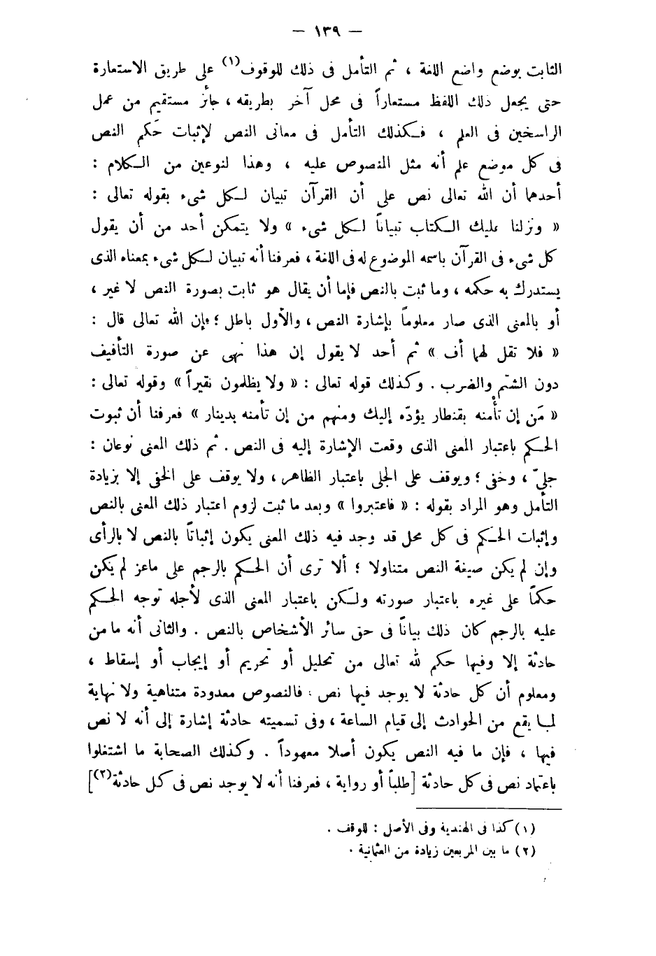 الثَّابِت بِوَضْع وَاضع اللُّغَة {لكل شَيْء} وَلَا يتَمَكَّن أحد من أَن يَقُول كل شَيْء فِي الْقُرْآن باسمه الْمَوْضُوع لَهُ فِي اللُّغَة فَعرفنَا أَنه تبيان لكل شَيْء بِمَعْنَاهُ الَّذِي يسْتَدرك بِهِ حكمه وَمَا ثَبت بِالنَّصِّ فإمَّا أَن يُقَال هُوَ ثَابت بِصُورَة النَّص لَا غير أَو بِالْمَعْنَى الَّذِي صَار مَعْلُوما بِإِشَارَة النَّص وَالْأول بَاطِل فَإِن الله تَعَالَى قَالَ {فَلَا تقل لَهما أُفٍّ} ثمَّ أحد لَا يَقُول إِن هَذَا نهي عَن صُورَة التأفيف دون الشتم وَالضَّرْب