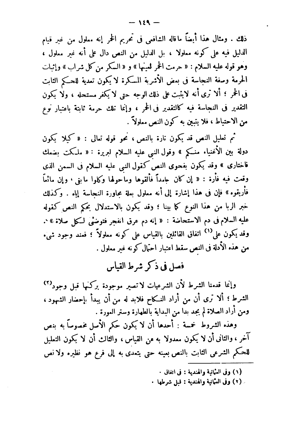 وَمِثَال هَذَا أَيْضا مَا قَالَه الشَّافِعِي فِي تَحْرِيم الْخمر إِنَّه مَعْلُول من غير قيام الدَّلِيل فِيهِ على كَونه معلولا بل الدَّلِيل من النَّص دَال على أَنه غير مَعْلُول وَهُوَ قَوْله عَلَيْهِ السَّلَام حرمت الْخمر لعينها وَالسكر من كل شراب وَإِثْبَات الْحُرْمَة وَصفَة النَّجَاسَة فِي بعض الْأَشْرِبَة المسكرة لَا يكون تَعديَة للْحكم الثَّابِت فِي الْخمر أَلا ترى أَنه لَا يثبت على ذَلِك الْوَجْه حَتَّى لَا يكفر مستحله وَلَا يكون التَّقْدِير فِي النَّجَاسَة فِيهِ كالتقدير فِي الْخمر وَإِنَّمَا تِلْكَ حُرْمَة ثَابِتَة بِاعْتِبَار نوع من الِاحْتِيَاط فَلَا يتَبَيَّن بِهِ كَون النَّص معلولا