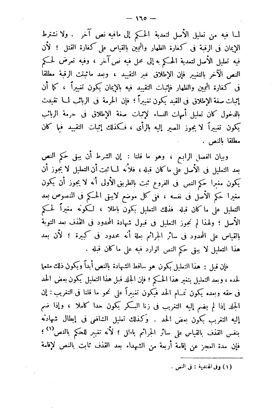 وَبَيَان الْفَصْل الرَّابِع وَهُوَ مَا قُلْنَا إِن الشَّرْط أَن يبْقى حكم النَّص بعد التَّعْلِيل فِي الأَصْل على مَا كَانَ قبله فَلِأَنَّهُ لما ثَبت أَن التَّعْلِيل لَا يجوز أَن يكون مغيرا حكم النَّص فِي الْفُرُوع ثَبت بِالطَّرِيقِ الأولى أَنه لَا يجوز أَن يكون مغيرا حكم الأَصْل فِي نَفسه فَفِي كل مَوضِع لَا يبْقى الحكم فِي الْمَنْصُوص بعد التَّعْلِيل على مَا كَانَ قبله فَذَلِك التَّعْلِيل يكون بَاطِلا لكَونه مغيرا لحكم الأَصْل وَلِهَذَا لم نجوز التَّعْلِيل فِي قبُول شَهَادَة الْمَحْدُود فِي الْقَذْف بعد التَّوْبَة بِالْقِيَاسِ على الْمَحْدُود فِي سَائِر الجرائم بعلة أَنه مَحْدُود فِي كَبِيرَة لِأَن بعد هَذَا التَّعْلِيل لَا يبْقى حكم النَّص الْوَارِد فِيهِ على مَا كَانَ قبله