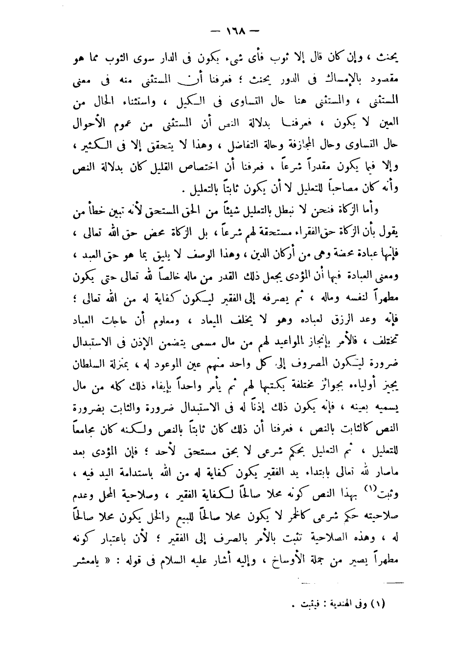 وَأما الزَّكَاة فَنحْن لَا نبطل بِالتَّعْلِيلِ شَيْئا من الْحق الْمُسْتَحق لِأَنَّهُ تبين خطأ من يَقُول بِأَن الزَّكَاة حق الْفُقَرَاء مُسْتَحقَّة لَهُم شرعا بل الزَّكَاة مَحْض حق الله تَعَالَى فَإِنَّهَا عبَادَة مَحْضَة وَهِي من أَرْكَان الدّين وَهَذَا الْوَصْف لَا يَلِيق بِمَا هُوَ حق العَبْد وَمعنى الْعِبَادَة فِيهَا أَن الْمُؤَدِّي يَجْعَل ذَلِك الْقدر من مَاله خَالِصا لله تَعَالَى حَتَّى يكون مطهرا لنَفسِهِ وَمَاله ثمَّ يصرفهُ إِلَى الْفَقِير ليَكُون كِفَايَة لَهُ من الله تَعَالَى فَإِنَّهُ وعد الرزق لِعِبَادِهِ وَهُوَ لَا يخلف الميعاد وَمَعْلُوم أَن حاجات الْعباد تخْتَلف فَالْأَمْر بإنجاز المواعيد لَهُم من مَال مُسَمّى يتَضَمَّن الْإِذْن فِي الِاسْتِبْدَال ضَرُورَة ليَكُون المصروف إِلَى كل وَاحِد مِنْهُم عين الْمَوْعُود لَهُ بِمَنْزِلَة السُّلْطَان يُجِيز أولياءه بجوائز مُخْتَلفَة يَكْتُبهَا لَهُم ثمَّ يَأْمر وَاحِدًا بإيفاء ذَلِك كُله من مَال يُسَمِّيه بِعَيْنِه فَإِنَّهُ يكون ذَلِك إِذْنا لَهُ فِي الِاسْتِبْدَال ضَرُورَة وَالثَّابِت بضرورة النَّص كَالثَّابِتِ بِالنَّصِّ فَعرفنَا أَن ذَلِك كَانَ ثَابتا بِالنَّصِّ وَلكنه كَانَ مجامعا للتَّعْلِيل ثمَّ التَّعْلِيل بِحكم شَرْعِي لَا بِحَق مُسْتَحقّ لأحد فَإِن الْمُؤَدى بعد مَا صَار لله تَعَالَى بابتداء يَد الْفَقِير يكون كِفَايَة لَهُ من الله باستدامة الْيَد فِيهِ وَثَبت بِهَذَا النَّص كَونه محلا صَالحا لكفاية الْفَقِير وصلاحية الْمحل وَعدم صلاحيته حكم شَرْعِي كَالْخمرِ لَا يكون محلا صَالحا للْبيع والخل يكون محلا صَالحا لَهُ وَهَذِه الصلاحية تثبت بِالْأَمر بِالصرْفِ إِلَى الْفَقِير لِأَن بِاعْتِبَار كَونه مطهرا يصير من جملَة الأوساخ وَإِلَيْهِ أَشَارَ عَلَيْهِ السَّلَام فِي قَوْله يَا معشر
