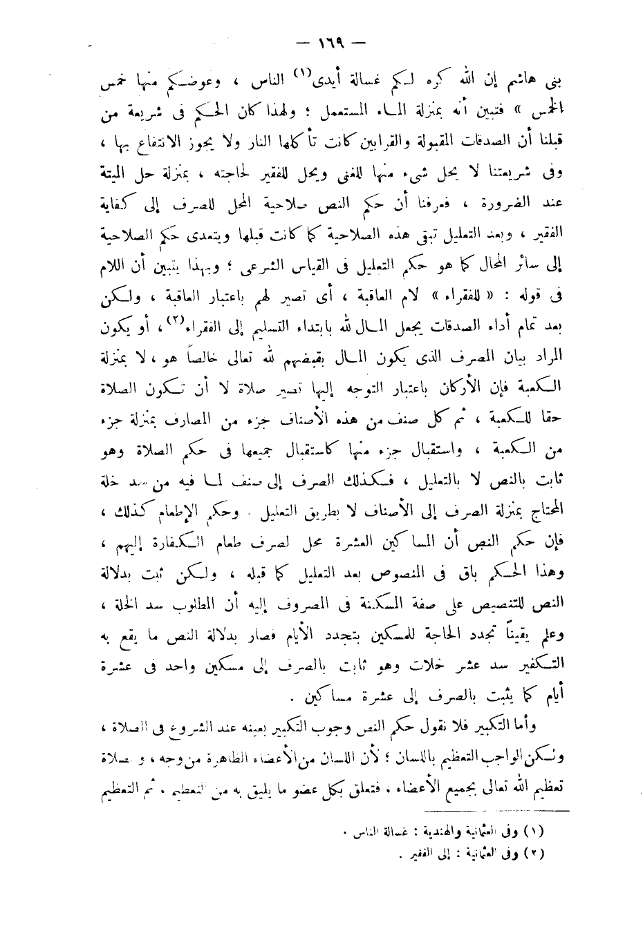 بني هَاشم إِن الله كره لكم غسالة أَيدي النَّاس وعوضكم مِنْهَا خمس الْخمس فَتبين أَنه بِمَنْزِلَة المَاء الْمُسْتَعْمل وَلِهَذَا كَانَ الحكم فِي شَرِيعَة من قبلنَا أَن الصَّدقَات المقبولة والقرابين كَانَت تأكلها النَّار وَلَا يجوز الِانْتِفَاع بهَا وَفِي شريعتنا لَا يحل شَيْء مِنْهَا للغني وَيحل للْفَقِير لِحَاجَتِهِ بِمَنْزِلَة حل الْميتَة عِنْد الضَّرُورَة فَعرفنَا أَن حكم النَّص صَلَاحِية الْمحل للصرف إِلَى كِفَايَة الْفَقِير وَبعد التَّعْلِيل تبقى هَذِه الصلاحية كَمَا كَانَت قبلهَا وَيَتَعَدَّى حكم الصلاحية إِلَى سَائِر الْمحَال كَمَا هُوَ حكم التَّعْلِيل فِي الْقيَاس الشَّرْعِيّ وَبِهَذَا يتَبَيَّن أَن اللَّام فِي قَوْله للْفُقَرَاء لَام الْعَاقِبَة أَي تصير لَهُم بِاعْتِبَار الْعَاقِبَة وَلَكِن بعد تَمام أَدَاء الصَّدقَات يَجْعَل المَال لله بابتداء التَّسْلِيم إِلَى الْفُقَرَاء أَو يكون المُرَاد بَيَان الْمصرف الَّذِي يكون المَال بقبضهم لله تَعَالَى خَالِصا هُوَ لَا بِمَنْزِلَة الْكَعْبَة فَإِن الْأَركان بِاعْتِبَار التَّوَجُّه إِلَيْهَا تصير صَلَاة لَا أَن تكون الصَّلَاة حَقًا للكعبة ثمَّ كل صنف من هَذِه الْأَصْنَاف جُزْء من المصارف بِمَنْزِلَة جُزْء من الْكَعْبَة واستقبال جُزْء مِنْهَا كاستقبال جَمِيعهَا فِي حكم الصَّلَاة وَهُوَ ثَابت بِالنَّصِّ لَا بِالتَّعْلِيلِ فَكَذَلِك الصّرْف إِلَى صنف لما فِيهِ من سد خلة الْمُحْتَاج بِمَنْزِلَة الصّرْف إِلَى الْأَصْنَاف لَا بطرِيق التَّعْلِيل