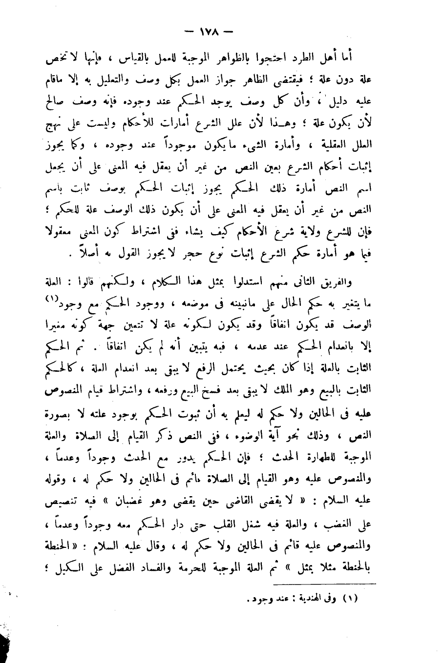 والفريق الثَّانِي مِنْهُم استدلوا بِمثل هَذَا الْكَلَام وَلَكنهُمْ قَالُوا الْعلَّة مَا يتَغَيَّر بِهِ حكم الْحَال على مَا نبينه فِي مَوْضِعه وَوُجُود الحكم مَعَ وجود الْوَصْف قد يكون اتِّفَاقًا وَقد يكون لكَونه عِلّة لَا تتَعَيَّن جِهَة كَونه مغيرا إِلَّا بانعدام الحكم عِنْد عَدمه فبه يتَبَيَّن أَنه لم يكن اتِّفَاقًا