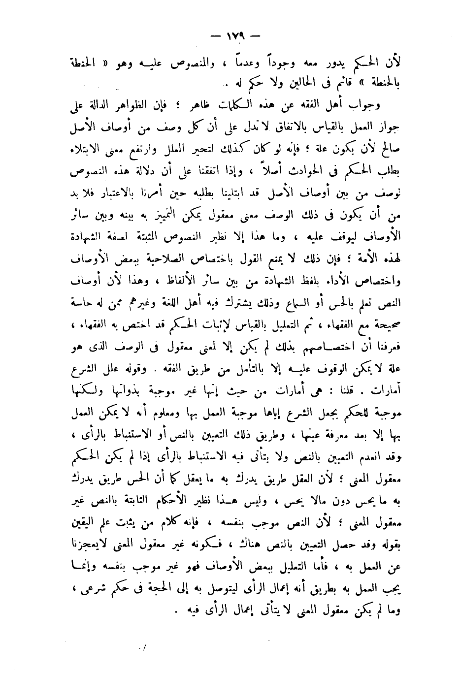 وَجَوَاب أهل الْفِقْه عَن هَذِه الْكَلِمَات ظَاهر فَإِن الظَّوَاهِر الدَّالَّة على جَوَاز الْعَمَل بِالْقِيَاسِ بالِاتِّفَاقِ لَا تدل على أَن كل وصف من أَوْصَاف الأَصْل صَالح لِأَن يكون عِلّة فَإِنَّهُ لَو كَانَ كَذَلِك لتحير الْمُعَلل وارتفع معنى الِابْتِلَاء بِطَلَب الحكم فِي الْحَوَادِث أصلا وَإِذا اتفقنا على أَن دلَالَة هَذِه النُّصُوص لوصف من بَين أَوْصَاف الأَصْل قد ابتلينا بِطَلَبِهِ حِين أمرنَا بِالِاعْتِبَارِ فَلَا بُد من أَن يكون فِي ذَلِك الْوَصْف معنى مَعْقُول يُمكن التَّمْيِيز بِهِ بَينه وَبَين سَائِر الْأَوْصَاف ليوقف عَلَيْهِ وَمَا هَذَا إِلَّا نَظِير النُّصُوص المثبتة لصفة الشَّهَادَة لهَذِهِ الْأمة فَإِن ذَلِك لَا يمْنَع القَوْل باختصاص الصلاحية بِبَعْض الْأَوْصَاف واختصاص الْأَدَاء بِلَفْظ الشَّهَادَة من بَين سَائِر الْأَلْفَاظ وَهَذَا لِأَن أَوْصَاف النَّص تعلم بالحس أَو السماع وَذَلِكَ يشْتَرك فِيهِ أهل اللُّغَة وَغَيرهم مِمَّن لَهُ حاسة صَحِيحَة مَعَ الْفُقَهَاء ثمَّ التَّعْلِيل بِالْقِيَاسِ لإِثْبَات الحكم قد اخْتصَّ بِهِ الْفُقَهَاء فَعرفنَا أَن اختصاصهم بذلك لم يكن إِلَّا لِمَعْنى مَعْقُول فِي الْوَصْف الَّذِي هُوَ عِلّة لَا يُمكن الْوُقُوف عَلَيْهِ إِلَّا بِالتَّأَمُّلِ من طَرِيق الْفِقْه