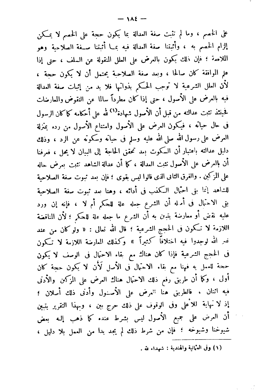 على الْخصم وَمَا لم تثبت صفة الْعَدَالَة بِمَا يكون حجَّة على الْخصم لَا يُمكن إِلْزَام الْخصم بِهِ وأثبتنا صفة الْعَدَالَة فِيهِ بِمَا أثبتنا صفة الصلاحية وَهُوَ الملاءمة فَإِن ذَلِك يكون بِالْعرضِ على الْعِلَل المنقولة عَن السّلف حَتَّى إِذا علم الْمُوَافقَة كَانَ صَالحا وَبعد صفة الصلاحية يحْتَمل أَن لَا يكون حجَّة لِأَن الْعِلَل الشَّرْعِيَّة لَا توجب الحكم بذواتها فَلَا بُد من إِثْبَات صفة الْعَدَالَة فِيهِ بِالْعرضِ على الْأُصُول حَتَّى إِذا كَانَ مطردا سالما عَن النقوض والمعارضات فَحِينَئِذٍ تثبت عَدَالَته من قبل أَن الْأُصُول شَهَادَة لله على أَحْكَامه كَمَا كَانَ الرَّسُول فِي حَال حَيَاته فَيكون الْعرض على الْأُصُول وَامْتِنَاع الْأُصُول من رده بِمَنْزِلَة الْعرض على رَسُول الله صلى الله عَلَيْهِ وَسلم فِي حَيَاته وسكوته عَن الرَّد وَذَلِكَ دَلِيل عَدَالَته بِاعْتِبَار أَن السُّكُوت بعد تحقق الْحَاجة إِلَى الْبَيَان لَا يحل فَعرفنَا أَن بِالْعرضِ على الْأُصُول تثبت الْعَدَالَة كَمَا أَن عَدَالَة الشَّاهِد تثبت بِعرْض حَاله على المزكين