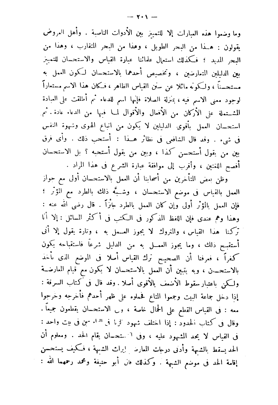 وَأهل الْعرُوض يَقُولُونَ هَذَا من الْبَحْر الطَّوِيل وَهَذَا من الْبَحْر المتقارب وَهَذَا من الْبَحْر المديد فَكَذَلِك اسْتِعْمَال عُلَمَائِنَا عبارَة الْقيَاس وَالِاسْتِحْسَان للتمييز بَين الدَّلِيلَيْنِ المتعارضين وَتَخْصِيص أَحدهمَا بالاستحسان لكَون الْعَمَل بِهِ مستحسنا ولكونه مائلا عَن سنَن الْقيَاس الظَّاهِر فَكَانَ هَذَا الِاسْم مستعارا لوُجُود معنى الِاسْم فِيهِ بِمَنْزِلَة الصَّلَاة فَإِنَّهَا اسْم للدُّعَاء ثمَّ أطلقت على الْعِبَادَة الْمُشْتَملَة على الْأَركان من الْأَفْعَال والأقوال لما فِيهَا من الدُّعَاء عَادَة