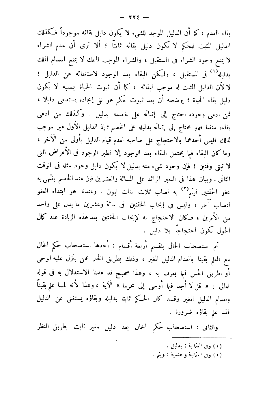 بَقَاء الْعَدَم كَمَا أَن الدَّلِيل الموجد للشَّيْء لَا يكون دَلِيل بَقَائِهِ مَوْجُودا فَكَذَلِك الدَّلِيل الْمُثبت للْحكم لَا يكون دَلِيل بَقَائِهِ ثَابتا أَلا ترى أَن عدم الشِّرَاء لَا يمْنَع وجود الشِّرَاء فِي الْمُسْتَقْبل وَالشِّرَاء الْمُوجب للْملك لَا يمْنَع انعدام الْملك بدليله فِي الْمُسْتَقْبل وَلَكِن الْبَقَاء بعد الْوُجُود لاستغنائه عَن الدَّلِيل لَا لِأَن الدَّلِيل الْمُثبت لَهُ مُوجب لبَقَائه كَمَا أَن ثُبُوت الْحَيَاة بِسَبَبِهِ لَا يكون دَلِيل بَقَاء الْحَيَاة يُوضحهُ أَن بعد ثُبُوت حكم هُوَ نفي إيجاده يَسْتَدْعِي دَلِيلا فَمن ادّعى وجوده احْتَاجَ إِلَى إثْبَاته على خَصمه بِدَلِيل