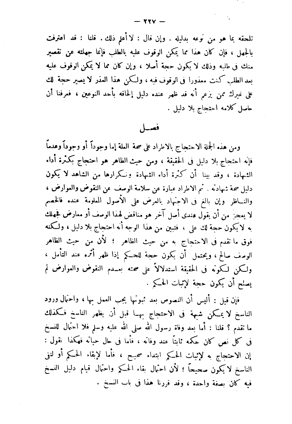 فَإِن قيل أَلَيْسَ أَن النُّصُوص بعد ثُبُوتهَا يجب الْعَمَل بهَا وَاحْتِمَال وُرُود النَّاسِخ لَا يُمكن شُبْهَة فِي الِاحْتِجَاج بهَا قبل أَن يظْهر النَّاسِخ فَكَذَلِك مَا تقدم قُلْنَا أما بعد وَفَاة رَسُول الله صلى الله عَلَيْهِ وَسلم فَلَا احْتِمَال للنسخ فِي كل نَص كَانَ حكمه ثَابتا عِنْد وَفَاته فَأَما فِي حَال حَيَاته فَهَكَذَا نقُول إِن الِاحْتِجَاج بِهِ لإِثْبَات الحكم ابْتِدَاء صَحِيح فَأَما لإبقاء الحكم أَو لنفي النَّاسِخ لَا يكون صَحِيحا لِأَن احْتِمَال بَقَاء الحكم وَاحْتِمَال قيام دَلِيل النّسخ فِيهِ كَانَ بِصفة وَاحِدَة وَقد قَررنَا هَذَا فِي بَاب النّسخ