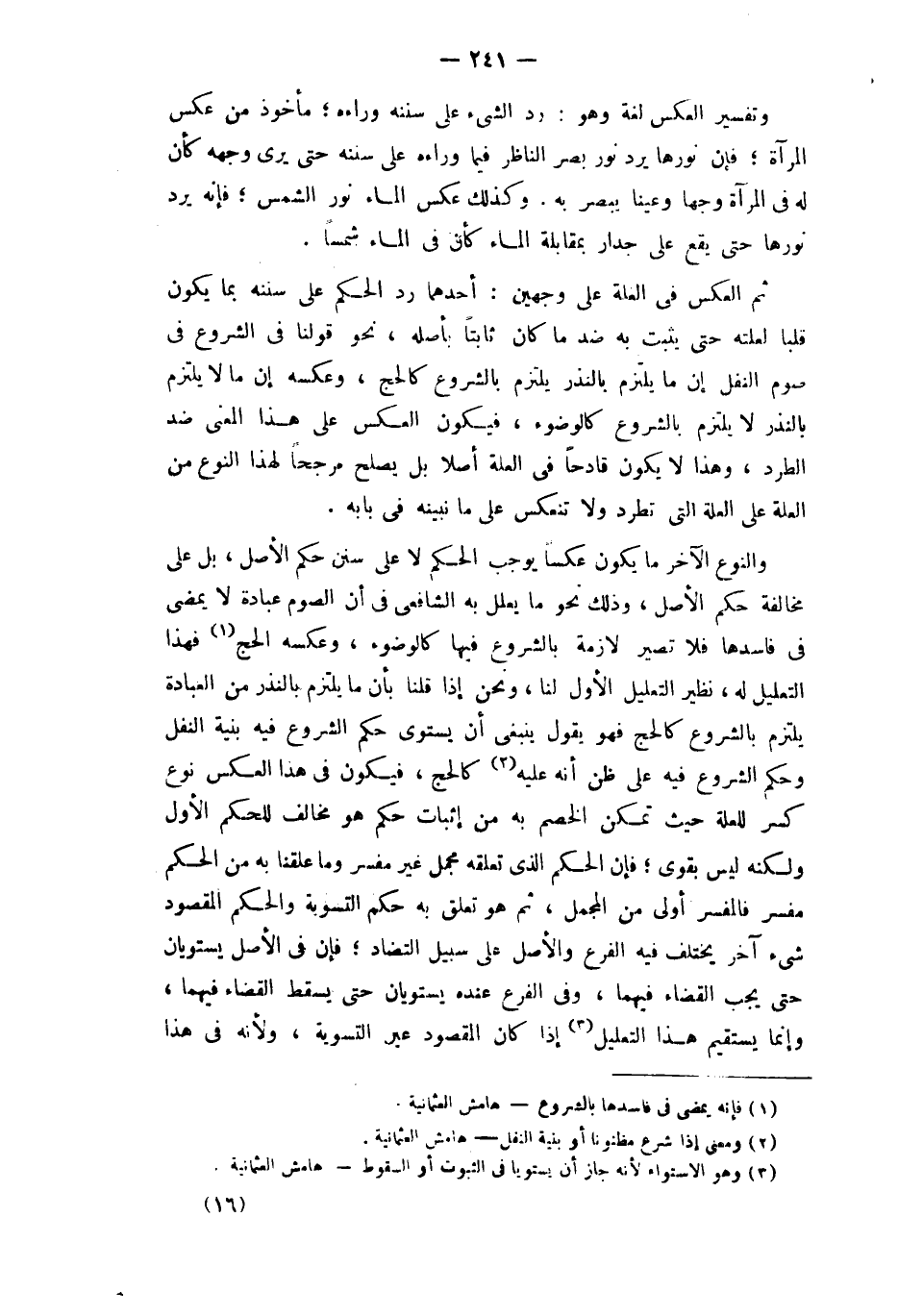 وَالنَّوْع الآخر مَا يكون عكسا يُوجب الحكم لَا على سنَن حكم الأَصْل بل على مُخَالفَة حكم الأَصْل وَذَلِكَ نَحْو مَا يُعلل بِهِ الشَّافِعِي فِي أَن الصَّوْم عبَادَة لَا يمْضِي فِي فاسدها فَلَا تصير لَازِمَة بِالشُّرُوعِ فِيهَا كَالْوضُوءِ وَعَكسه الْحَج فَهَذَا التَّعْلِيل لَهُ نَظِير التَّعْلِيل الأول لنا وَنحن إِذا قُلْنَا بِأَن مَا يلْتَزم بِالنذرِ من الْعَادة يلْتَزم بِالشُّرُوعِ كَالْحَجِّ فَهُوَ يَقُول يَنْبَغِي أَن يَسْتَوِي حكم الشُّرُوع فِيهِ بنية النَّفْل وَحكم الشُّرُوع فِيهِ على ظن أَنه عَلَيْهِ كَالْحَجِّ فَيكون فِي هَذَا الْعَكْس نوع كسر لِلْعِلَّةِ حَيْثُ تمكن الْخصم بِهِ من إِثْبَات حكم هُوَ مُخَالف للْحكم الأول وَلكنه لَيْسَ بِقَوي فَإِن الحكم الَّذِي تعلقه مُجمل غير مُفَسّر وَمَا علقنا بِهِ من الحكم مُفَسّر فالمفسر أولى من الْمُجْمل ثمَّ هُوَ تعلق بِهِ حكم التَّسْوِيَة وَالْحكم الْمَقْصُود شَيْء آخر يخْتَلف فِيهِ الْفَرْع وَالْأَصْل على سَبِيل التضاد فَإِن فِي الأَصْل يستويان حَتَّى يجب الْقَضَاء فيهمَا وَفِي الْفَرْع عِنْده يستويان حَتَّى يسْقط الْقَضَاء فيهمَا وَإِنَّمَا يَسْتَقِيم هَذَا التَّعْلِيل إِذا كَانَ الْمَقْصُود عين التَّسْوِيَة وَلِأَنَّهُ فِي هَذَا