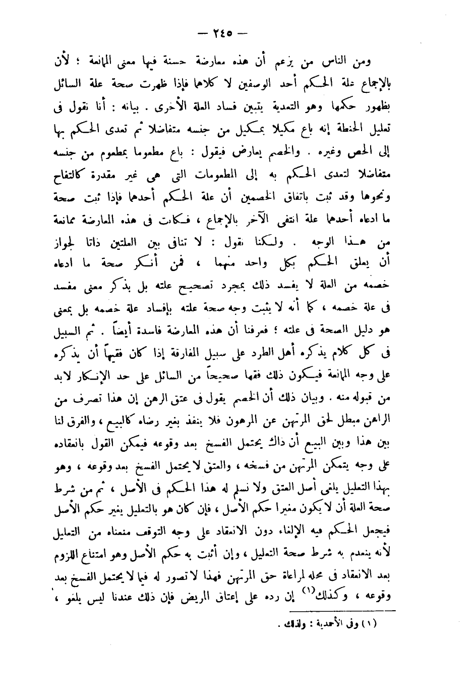 وَبَيَان ذَلِك أَن الْخصم يَقُول فِي عتق الرَّهْن إِن هَذَا تصرف من الرَّاهِن مُبْطل لحق الْمُرْتَهن عَن الْمَرْهُون فَلَا ينفذ بِغَيْر رِضَاهُ كَالْبيع وَالْفرق لنا بَين هَذَا وَبَين البيع أَن ذَاك يحْتَمل الْفَسْخ بعد وُقُوعه فَيمكن القَوْل بانعقاده على وَجه يتَمَكَّن الْمُرْتَهن من فَسخه وَالْعِتْق لَا يحْتَمل الْفَسْخ بعد وُقُوعه وَهُوَ بِهَذَا التَّعْلِيل يلغي أصل الْعتْق وَلَا نسلم لَهُ هَذَا الحكم فِي الأَصْل ثمَّ من شَرط صِحَة الْعلَّة أَن لَا يكون مغيرا حكم الأَصْل فَإِن كَانَ هُوَ بِالتَّعْلِيلِ يُغير حكم الأَصْل فَيجْعَل الحكم فِيهِ الإلغاء دون الِانْعِقَاد على وَجه التَّوَقُّف منعناه من التَّعْلِيل لِأَنَّهُ يَنْعَدِم بِهِ شَرط صِحَة التَّعْلِيل وَإِن أثبت بِهِ حكم الأَصْل وَهُوَ امْتنَاع اللُّزُوم بعد الِانْعِقَاد فِي مَحَله لمراعاة حق الْمُرْتَهن فَهَذَا لَا تصور لَهُ فِيمَا لَا يحْتَمل الْفَسْخ بعد وُقُوعه وَكَذَلِكَ إِن رده على إِعْتَاق الْمَرِيض فَإِن ذَلِك عندنَا لَيْسَ يَلْغُو