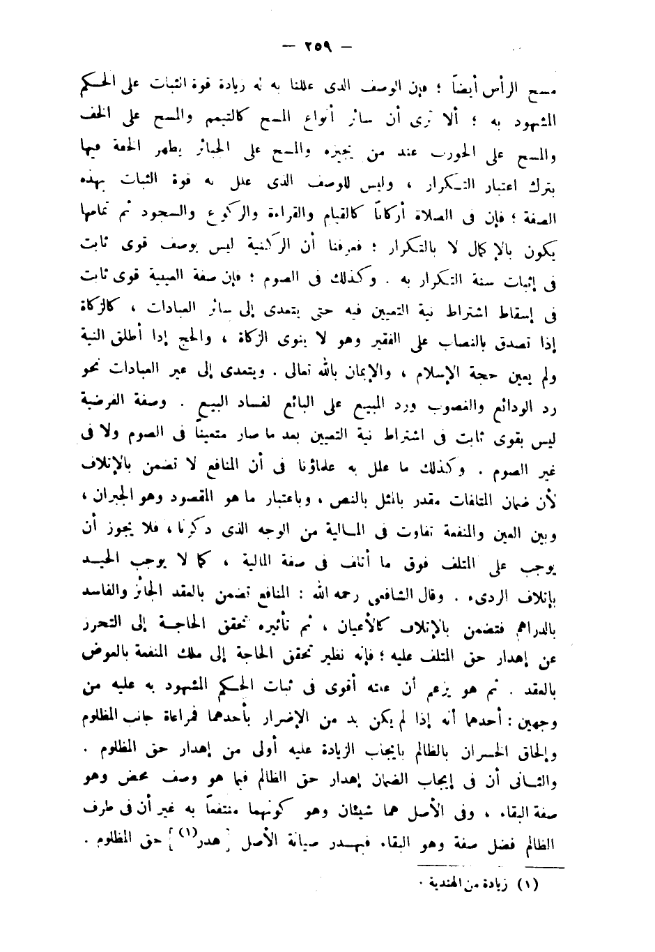 مسح الرَّأْس أَيْضا فَإِن الْوَصْف الَّذِي عللنا بِهِ لَهُ زِيَادَة قُوَّة الثَّبَات على الحكم الْمَشْهُود بِهِ أَلا ترى أَن سَائِر أَنْوَاع الْمسْح كالتيمم وَالْمسح على الْخُف وَالْمسح على الجورب عِنْد من يُجِيزهُ وَالْمسح على الجبائر يظْهر الخفة فِيهَا بترك اعْتِبَار التّكْرَار وَلَيْسَ للوصف الَّذِي علل بِهِ قُوَّة الثَّبَات بِهَذِهِ الصّفة فَإِن فِي الصَّلَاة أركانا كالقيام وَالْقِرَاءَة وَالرُّكُوع وَالسُّجُود ثمَّ تَمامهَا يكون بالإكمال لَا بالتكرار فَعرفنَا أَن الركنية لَيْسَ بِوَصْف قوي ثَابت فِي إِثْبَات سنة التّكْرَار بِهِ وَكَذَلِكَ فِي الصَّوْم فَإِن صفة العينية قوي ثَابت فِي إِسْقَاط اشْتِرَاط نِيَّة التَّعْيِين فِيهِ حَتَّى يتَعَدَّى إِلَى سَائِر الْعِبَادَات كَالزَّكَاةِ إِذا تصدق بالنصاب على الْفَقِير وَهُوَ لَا يَنْوِي الزَّكَاة وَالْحج إِذا أطلق النِّيَّة وَلم يعين حجَّة الْإِسْلَام وَالْإِيمَان بِاللَّه تَعَالَى