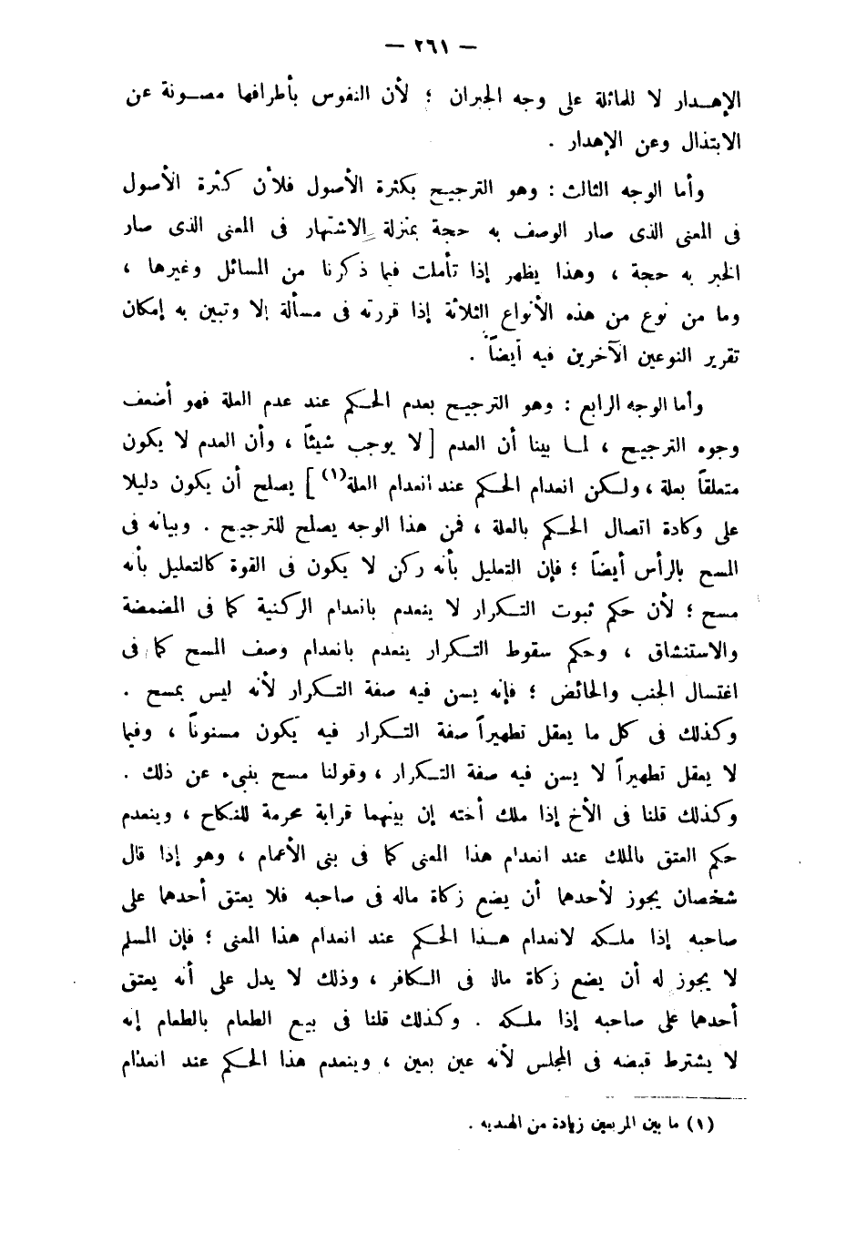 وَأما الْوَجْه الرَّابِع وَهُوَ التَّرْجِيح بِعَدَمِ الحكم عِنْد عدم الْعلَّة فَهُوَ أَضْعَف وُجُوه التَّرْجِيح لما بَينا أَن الْعَدَم (لَا يُوجب شَيْئا وَأَن الْعَدَم لَا يكون مُتَعَلقا بعلة وَلَكِن انعدام الحكم عِنْد انعدام الْعلَّة) يصلح أَن يكون دَلِيلا على وكادة اتِّصَال الحكم بِالْعِلَّةِ فَمن هَذَا الْوَجْه يصلح للترجيح