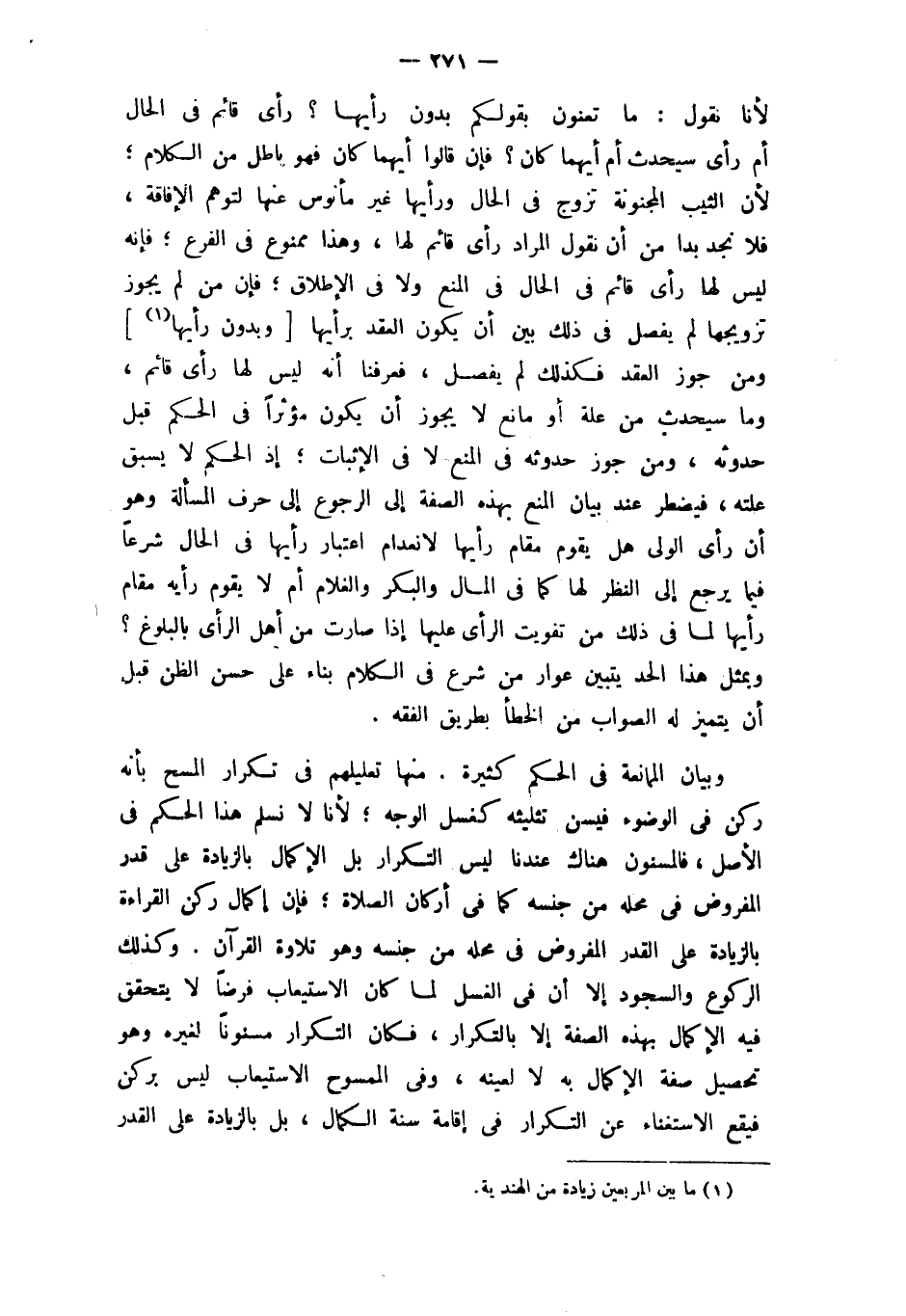 مِنْهَا تَعْلِيلهم فِي تكْرَار الْمسْح بِأَنَّهُ ركن فِي الْوضُوء فَيسنّ تثليثه كَغسْل الْوَجْه لأَنا لَا نسلم هَذَا الحكم فِي الأَصْل فالمسنون هُنَاكَ عندنَا لَيْسَ التّكْرَار بل الْإِكْمَال بِالزِّيَادَةِ على قدر الْمَفْرُوض فِي مَحَله من جنسه كَمَا فِي أَرْكَان الصَّلَاة فَإِن إِكْمَال ركن الْقِرَاءَة بِالزِّيَادَةِ على الْقدر الْمَفْرُوض فِي مَحَله من جنسه وَهُوَ تِلَاوَة الْقُرْآن