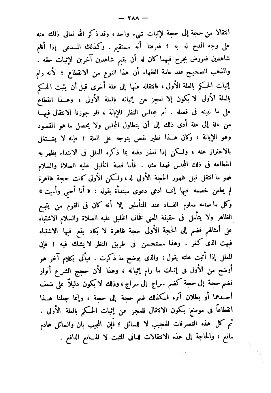 فَيَأْتِي بِكَلَام آخر هُوَ أوضح من الأول فِي إِثْبَات مَا رام إثْبَاته وَهَذَا لِأَن حجج الشَّرْع أنوار فضم حجَّة إِلَى حجَّة كضم سراج إِلَى سراج وَذَلِكَ لَا يكون دَلِيلا على ضعف أَحدهمَا أَو بطلَان أَثَره فَكَذَلِك ضم حجَّة إِلَى حجَّة وَإِنَّمَا جعلنَا هَذَا انْقِطَاعًا فِي مَوضِع يكون الِانْتِقَال للعجز عَن إِثْبَات الحكم بِالْعِلَّةِ الأولى