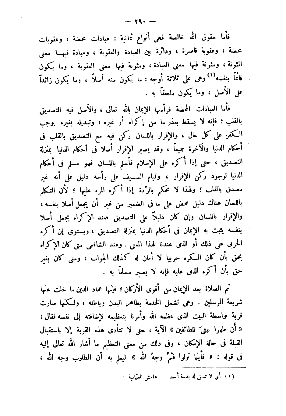 فَأَما الْعِبَادَات الْمَحْضَة فرأسها الْإِيمَان بِاللَّه تَعَالَى وَالْأَصْل فِيهِ التَّصْدِيق بِالْقَلْبِ فَإِنَّهُ لَا يسْقط بِعُذْر مَا من إِكْرَاه أَو غَيره وتبديله بِغَيْرِهِ يُوجب الْكفْر على كل حَال وَالْإِقْرَار بِاللِّسَانِ ركن فِيهِ مَعَ التَّصْدِيق بِالْقَلْبِ فِي أَحْكَام الدُّنْيَا وَالْآخِرَة جَمِيعًا وَقد يصير الْإِقْرَار أصلا فِي أَحْكَام الدُّنْيَا بِمَنْزِلَة التَّصْدِيق حَتَّى إِذا أكره على الْإِسْلَام فَأسلم بِاللِّسَانِ فَهُوَ مُسلم فِي أَحْكَام الدُّنْيَا لوُجُود ركن الْإِقْرَار وَقيام السَّيْف على رَأسه دَلِيل على أَنه غير مُصدق بِالْقَلْبِ وَلِهَذَا لَا يحكم بِالرّدَّةِ إِذا أكره الْمَرْء عَلَيْهَا لِأَن التَّكَلُّم بِاللِّسَانِ هُنَاكَ دَلِيل مَحْض على مَا فِي الضَّمِير من غير أَن يَجْعَل أصلا بِنَفسِهِ وَالْإِقْرَار بِاللِّسَانِ وَإِن كَانَ دَلِيلا على التَّصْدِيق فَعِنْدَ الْإِكْرَاه يَجْعَل أصلا بِنَفسِهِ يثبت بِهِ الْإِيمَان فِي أَحْكَام الدُّنْيَا بِمَنْزِلَة التَّصْدِيق وَيَسْتَوِي إِن أكره الْحَرْبِيّ على ذَلِك أَو الذِّمِّيّ عندنَا لهَذَا الْمَعْنى