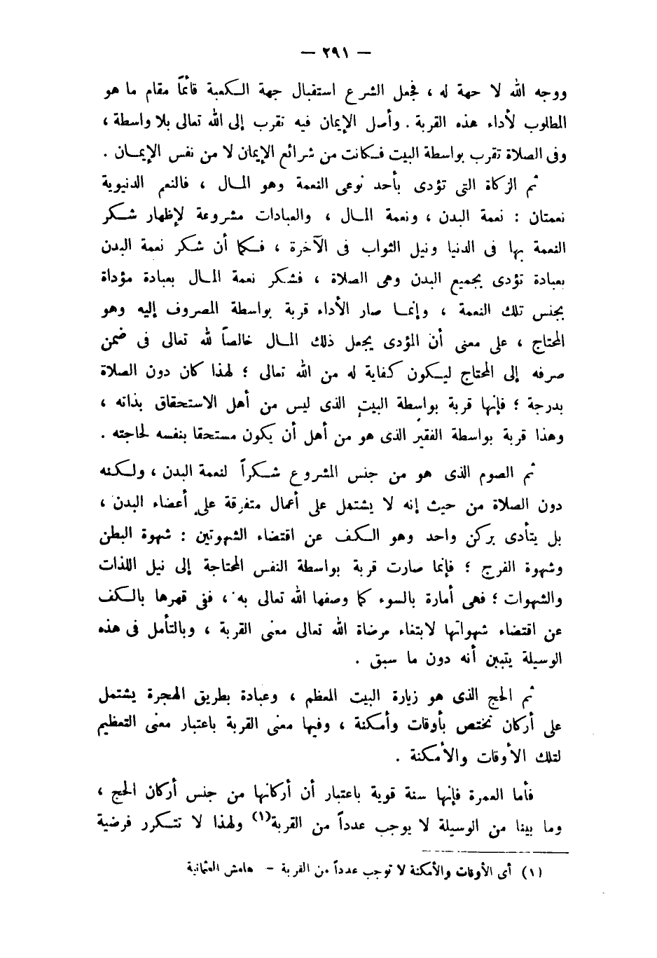 ثمَّ الْحَج الَّذِي هُوَ زِيَارَة الْبَيْت الْمُعظم وَعبادَة بطرِيق الْهِجْرَة يشْتَمل على أَرْكَان تخْتَص بأوقات وأمكنة وفيهَا معنى الْقرْبَة بِاعْتِبَار معنى التَّعْظِيم لتِلْك الْأَوْقَات والأمكنة