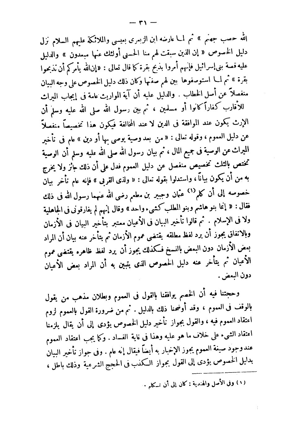 ثمَّ لما عَارضه ابْن الزبعري بِعِيسَى وَالْمَلَائِكَة عَلَيْهِم السَّلَام نزل دَلِيل الْخُصُوص {إِن الَّذين سبقت لَهُم منا الْحسنى أُولَئِكَ عَنْهَا مبعدون} وَالدَّلِيل عَلَيْهِ قصَّة بني إِسْرَائِيل فَإِنَّهُم أمروا بِذبح بقرة كَمَا قَالَ تَعَالَى {إِن الله يَأْمُركُمْ أَن تذبحوا بقرة} ثمَّ لما استوصفوها بَين لَهُم صفتهَا وَكَانَ ذَلِك دَلِيل الْخُصُوص على وَجه الْبَيَان مُنْفَصِلا عَن أصل الْخطاب