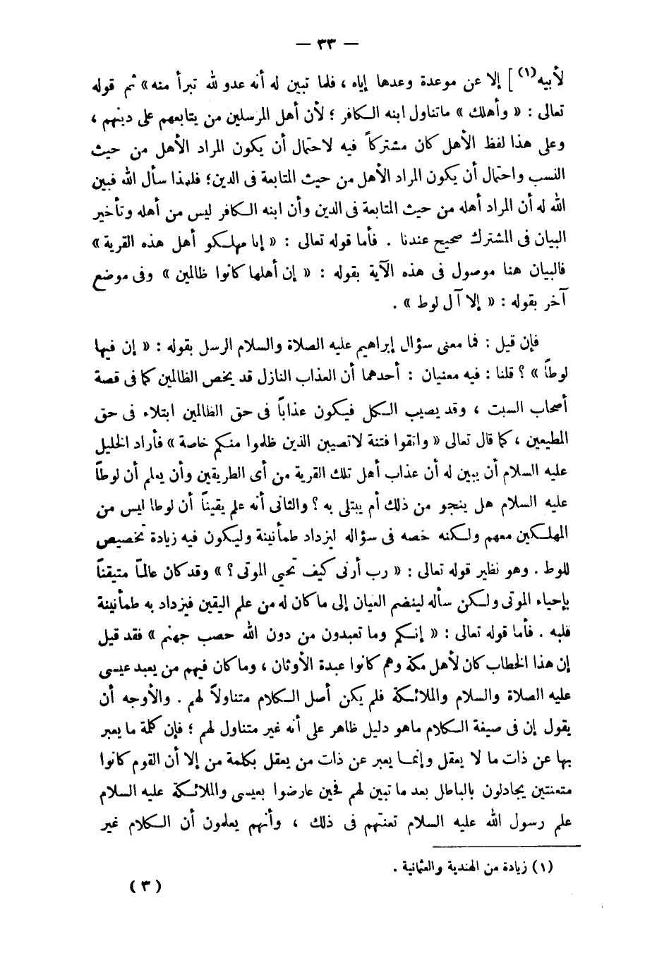 ثمَّ قَوْله تَعَالَى {وَأهْلك} مَا تنَاول ابْنه الْكَافِر لِأَن أهل الْمُرْسلين من يتابعهم على دينهم وعَلى هَذَا لفظ الْأَهْل كَانَ مُشْتَركا فِيهِ لاحْتِمَال أَن يكون المُرَاد الْأَهْل من حَيْثُ النّسَب وَاحْتِمَال أَن يكون المُرَاد الْأَهْل من حَيْثُ الْمُتَابَعَة فِي الدّين فَلهَذَا سَأَلَ الله فَبين الله لَهُ أَن المُرَاد أَهله من حَيْثُ الْمُتَابَعَة فِي الدّين وَأَن ابْنه الْكَافِر لَيْسَ من أَهله وَتَأْخِير الْبَيَان فِي الْمُشْتَرك صَحِيح عندنَا