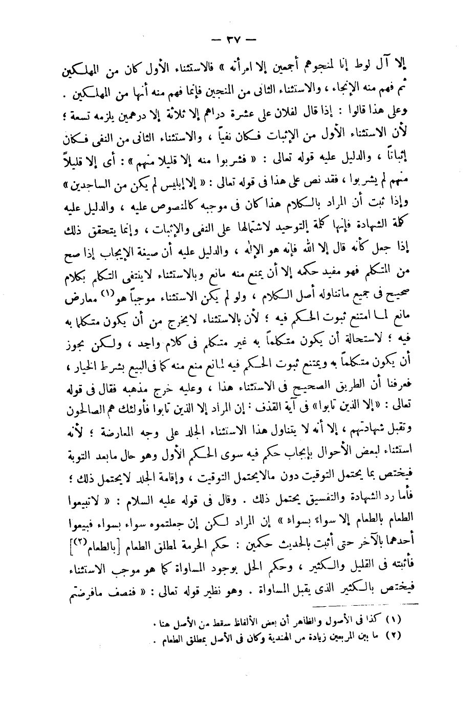 وعَلى هَذَا قَالُوا إِذا قَالَ لفُلَان عَليّ عشرَة دَرَاهِم إِلَّا ثَلَاثَة إِلَّا دِرْهَمَيْنِ يلْزمه تِسْعَة لِأَن الِاسْتِثْنَاء الأول من الْإِثْبَات فَكَانَ نفيا وَالِاسْتِثْنَاء الثَّانِي من النَّفْي فَكَانَ إِثْبَاتًا وَالدَّلِيل عَلَيْهِ قَوْله تَعَالَى {فَشَرِبُوا مِنْهُ إِلَّا قَلِيلا مِنْهُم} أَي إِلَّا قَلِيلا مِنْهُم لم يشْربُوا فقد نَص على هَذَا فِي قَوْله تَعَالَى {إِلَّا إِبْلِيس لم يكن من الساجدين} وَإِذا ثَبت أَن المُرَاد بالْكلَام هَذَا كَانَ فِي مُوجبه كالمنصوص عَلَيْهِ وَالدَّلِيل عَلَيْهِ كلمة الشَّهَادَة فَإِنَّهَا كلمة التَّوْحِيد لاشتمالها على النَّفْي وَالْإِثْبَات وَإِنَّمَا يتَحَقَّق ذَلِك إِذا جعل كَأَنَّهُ قَالَ إِلَّا الله فَإِنَّهُ هُوَ الْإِلَه وَالدَّلِيل عَلَيْهِ أَن صِيغَة الْإِيجَاب إِذا صَحَّ من الْمُتَكَلّم فَهُوَ مُفِيد حكمه إِلَّا أَن يمْنَع مِنْهُ مَانع وبالاستثناء لَا يَنْتَفِي التَّكَلُّم بِكَلَام صَحِيح فِي جَمِيع مَا تنَاوله أصل الْكَلَام وَلَو لم يكن الِاسْتِثْنَاء مُوجبا هُوَ معَارض مَانع لما امْتنع ثُبُوت الحكم فِيهِ لِأَن بِالِاسْتِثْنَاءِ لَا يخرج من أَن يكون متكلما بِهِ فِيهِ لِاسْتِحَالَة أَن يكون متكلما بِهِ غير مُتَكَلم فِي كَلَام وَاحِد وَلَكِن يجوز أَن يكون متكلما بِهِ وَيمْتَنع ثُبُوت الحكم فِيهِ لمَانع منع مِنْهُ كَمَا فِي البيع بِشَرْط الْخِيَار فَعرفنَا أَن الطَّرِيق الصَّحِيح فِي الِاسْتِثْنَاء هَذَا وَعَلِيهِ خرج مذْهبه فَقَالَ فِي قَوْله تَعَالَى {إِلَّا الَّذين تَابُوا} فِي آيَة الْقَذْف إِن المُرَاد إِلَّا الَّذين تَابُوا فَأُولَئِك هم الصالحون وَتقبل شَهَادَتهم إِلَّا أَنه لَا يتَنَاوَل هَذَا الِاسْتِثْنَاء الْجلد على وَجه الْمُعَارضَة لِأَنَّهُ اسْتثِْنَاء لبَعض الْأَحْوَال بِإِيجَاب حكم فِيهِ سوى الحكم الأول وَهُوَ حَال مَا بعد التَّوْبَة فَيخْتَص بِمَا يحْتَمل التَّوْقِيت دون مَا لَا يحْتَمل التَّوْقِيت وَإِقَامَة الْجلد لَا يحْتَمل ذَلِك فَأَما رد الشَّهَادَة والتفسيق يحْتَمل ذَلِك