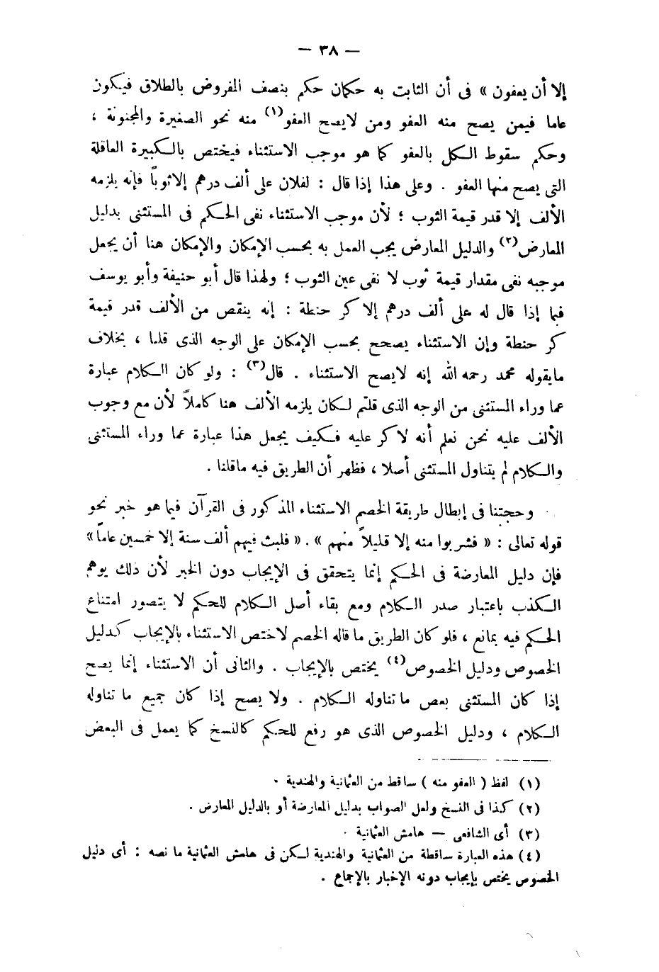 {فَلبث فيهم ألف سنة إِلَّا خمسين عَاما} فَإِن دَلِيل الْمُعَارضَة فِي الحكم إِنَّمَا يتَحَقَّق فِي الْإِيجَاب دون الْخَبَر لِأَن ذَلِك يُوهم الْكَذِب بِاعْتِبَار صدر الْكَلَام وَمَعَ بَقَاء أصل الْكَلَام للْحكم لَا يتَصَوَّر امْتنَاع الحكم فِيهِ بمانع فَلَو كَانَ الطَّرِيق مَا قَالَه الْخصم لاختص الِاسْتِثْنَاء بِالْإِيجَابِ كدليل الْخُصُوص وَدَلِيل الْخُصُوص يخْتَص بِالْإِيجَابِ