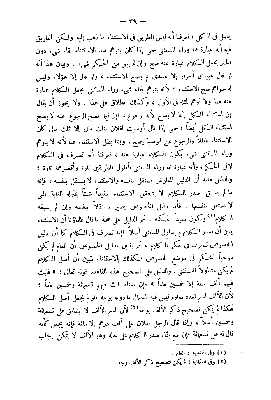 ثمَّ الدَّلِيل على صِحَة مَا قَالَ عُلَمَاؤُنَا أَن الِاسْتِثْنَاء يبين أَن صدر الْكَلَام لم يتَنَاوَل الْمُسْتَثْنى أصلا فَإِنَّهُ تصرف فِي الْكَلَام كَمَا أَن دَلِيل الْخُصُوص تصرف فِي حكم الْكَلَام ثمَّ يتَبَيَّن بِدَلِيل الْخُصُوص أَن الْعَام لم يكن مُوجبا الحكم فِي مَوضِع الْخُصُوص فَكَذَلِك بِالِاسْتِثْنَاءِ يتَبَيَّن أَن أصل الْكَلَام لم يكن متناولا للمستثنى