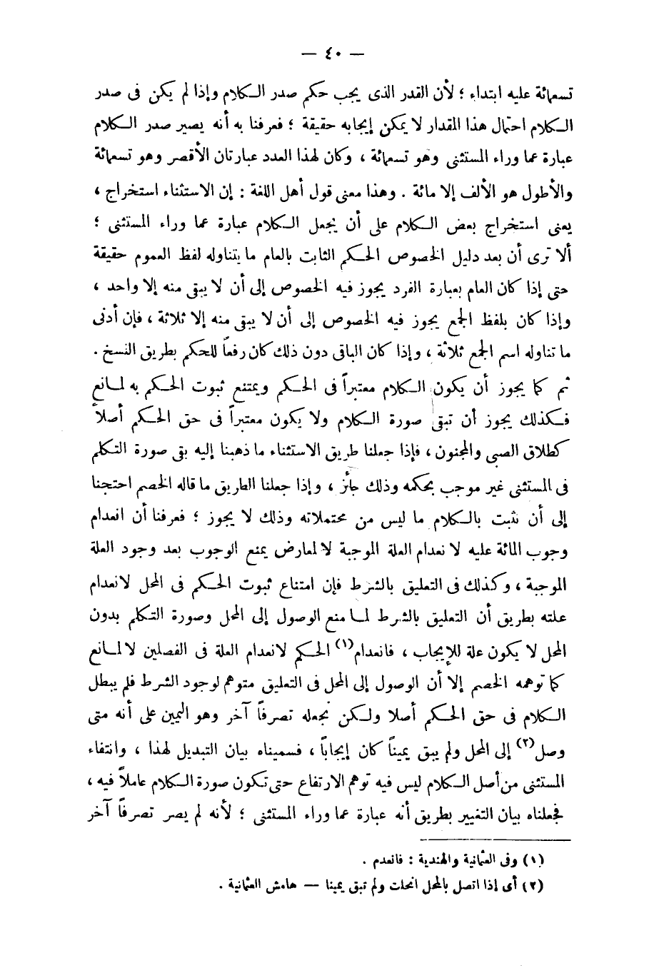 ثمَّ كَمَا يجوز أَن يكون الْكَلَام مُعْتَبرا فِي الحكم وَيمْتَنع ثُبُوت الحكم بِهِ لمَانع فَكَذَلِك يجوز أَن تبقى صُورَة الْكَلَام وَلَا يكون مُعْتَبرا فِي حق الحكم أصلا كَطَلَاق الصَّبِي وَالْمَجْنُون فَإِذا جعلنَا طَرِيق الِاسْتِثْنَاء مَا ذَهَبْنَا إِلَيْهِ بَقِي صُورَة التَّكَلُّم فِي الْمُسْتَثْنى غير مُوجب بِحكمِهِ وَذَلِكَ جَائِز وَإِذا جعلنَا الطَّرِيق مَا قَالَه الْخصم احتجنا إِلَى أَن نثبت بالْكلَام مَا لَيْسَ من محتملاته وَذَلِكَ لَا يجوز فَعرفنَا أَن انعدام وجوب الْمِائَة عَلَيْهِ لِانْعِدَامِ الْعلَّة الْمُوجبَة لَا لمعارض يمْنَع الْوُجُوب بعد وجود الْعلَّة الْمُوجبَة وَكَذَلِكَ فِي التَّعْلِيق بِالشّرطِ فَإِن امْتنَاع ثُبُوت الحكم فِي الْمحل لِانْعِدَامِ علته بطرِيق أَن التَّعْلِيق بِالشّرطِ لما منع الْوُصُول إِلَى الْمحل وَصُورَة التَّكَلُّم بِدُونِ الْمحل لَا يكون عِلّة للْإِيجَاب فانعدام الحكم لِانْعِدَامِ الْعلَّة فِي الْفَصْلَيْنِ لَا لمَانع كَمَا توهمه الْخصم إِلَّا أَن الْوُصُول إِلَى الْمحل فِي التَّعْلِيق متوهم لوُجُود الشَّرْط فَلم يبطل الْكَلَام فِي حق الحكم أصلا وَلَكِن نجعله تَصرفا آخر وَهُوَ الْيَمين على أَنه مَتى وصل إِلَى الْمحل وَلم يبْق يَمِينا كَانَ إِيجَابا فسميناه بَيَان التبديل لهَذَا وَانْتِفَاء الْمُسْتَثْنى من أصل الْكَلَام لَيْسَ فِيهِ توهم الِارْتفَاع حَتَّى تكون صُورَة الْكَلَام عَاملا فِيهِ فجعلناه بَيَان التَّغْيِير بطرِيق أَنه عبارَة عَمَّا وَرَاء الْمُسْتَثْنى لِأَنَّهُ لم يصر تَصرفا آخر