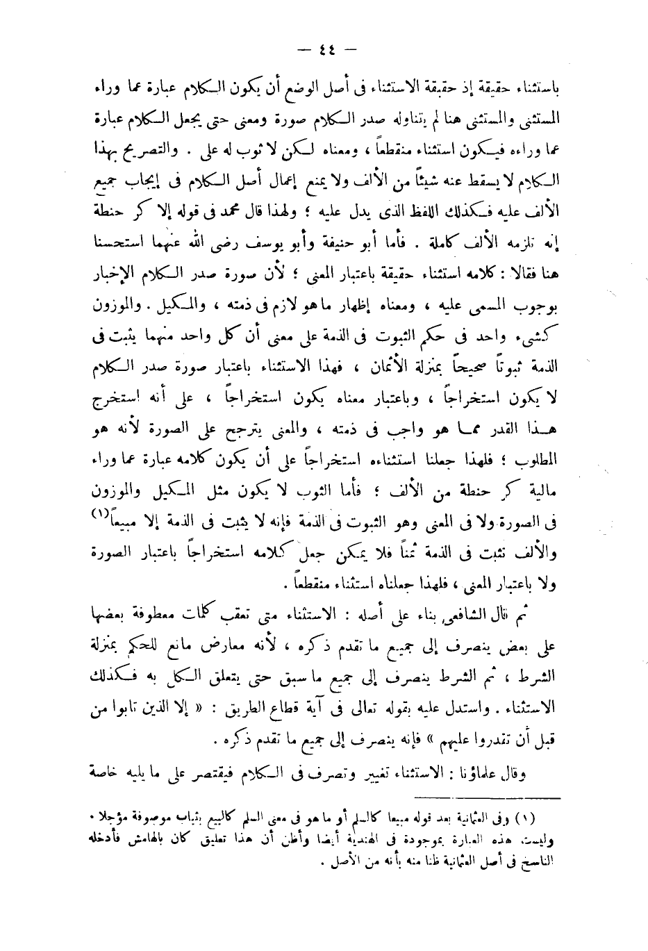 فَأَما أَبُو حنيفَة وَأَبُو يُوسُف رَضِي الله عَنْهُمَا استحسنا هُنَا فَقَالَا كَلَامه اسْتثِْنَاء حَقِيقَة بِاعْتِبَار الْمَعْنى لِأَن صُورَة صدر الْكَلَام الْإِخْبَار بِوُجُوب الْمُسَمّى عَلَيْهِ وَمَعْنَاهُ إِظْهَار مَا هُوَ لَازم فِي ذمَّته والمكيل وَالْمَوْزُون كشيء وَاحِد فِي حكم الثُّبُوت فِي الذِّمَّة على معنى أَن كل وَاحِد مِنْهُمَا يثبت فِي الذِّمَّة ثبوتا صَحِيحا بِمَنْزِلَة الْأَثْمَان فَهَذَا الِاسْتِثْنَاء بِاعْتِبَار صُورَة صدر الْكَلَام لَا يكون استخراجا وَبِاعْتِبَار مَعْنَاهُ يكون استخراجا على أَنه استخرج هَذَا الْقدر مِمَّا هُوَ وَاجِب فِي ذمَّته وَالْمعْنَى يتَرَجَّح على الصُّورَة لِأَنَّهُ هُوَ الْمَطْلُوب فَلهَذَا جعلنَا استثناءه استخراجا على أَن يكون كَلَامه عبارَة عَمَّا وَرَاء مَالِيَّة كرّ حِنْطَة من الْألف فَأَما الثَّوْب لَا يكون مثل الْمكيل وَالْمَوْزُون فِي الصُّورَة وَلَا فِي الْمَعْنى وَهُوَ الثُّبُوت فِي الذِّمَّة فَإِنَّهُ لَا يثبت فِي الذِّمَّة إِلَّا مَبِيعًا وَالْألف تثبت فِي الذِّمَّة ثمنا فَلَا يُمكن جعل كَلَامه استخراجا بِاعْتِبَار الصُّورَة وَلَا بِاعْتِبَار الْمَعْنى فَلهَذَا جَعَلْنَاهُ اسْتثِْنَاء مُنْقَطِعًا