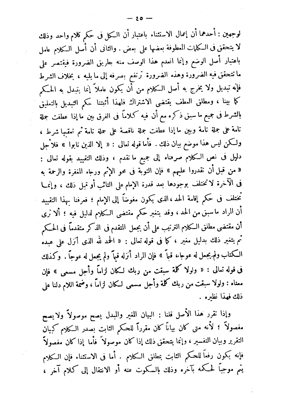 أما فِي الِاسْتِثْنَاء فَإِن الْكَلَام يتم مُوجبا لحكمه بِآخِرهِ وَذَلِكَ بِالسُّكُوتِ عَنهُ أَو الِانْتِقَال إِلَى كَلَام آخر