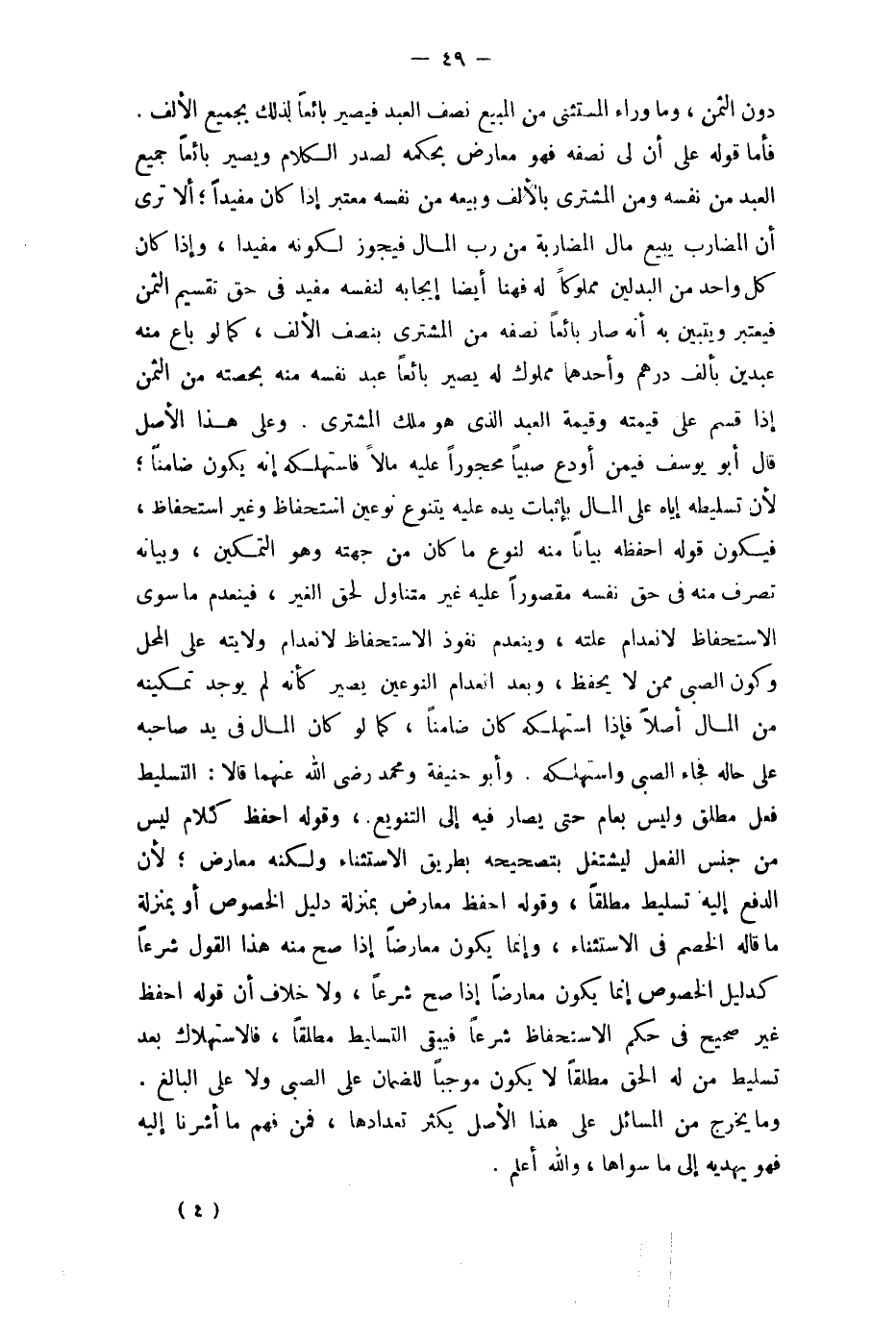 وَأَبُو حنيفَة وَمُحَمّد رَضِي الله عَنْهُمَا قَالَا التسليط فعل مُطلق وَلَيْسَ بعام حَتَّى يُصَار فِيهِ إِلَى التنويع وَقَوله احفظ كَلَام لَيْسَ من جنس الْفِعْل ليشتغل بِتَصْحِيحِهِ بطرِيق الِاسْتِثْنَاء وَلكنه معَارض لِأَن الدّفع إِلَيْهِ تسليط مُطلقًا وَقَوله احفظ معَارض بِمَنْزِلَة دَلِيل الْخُصُوص أَو بِمَنْزِلَة مَا قَالَه الْخصم فِي الِاسْتِثْنَاء وَإِنَّمَا يكون مُعَارضا إِذا صَحَّ مِنْهُ هَذَا القَوْل شرعا كدليل الْخُصُوص إِنَّمَا يكون مُعَارضا إِذا صَحَّ شرعا وَلَا خلاف أَن قَوْله احفظ غير صَحِيح فِي حكم الاستحفاظ شرعا فَيبقى التسليط مُطلقًا فالاستهلاك بعد تسليط من لَهُ الْحق مُطلقًا لَا يكون مُوجبا للضَّمَان على الصَّبِي وَلَا على الْبَالِغ