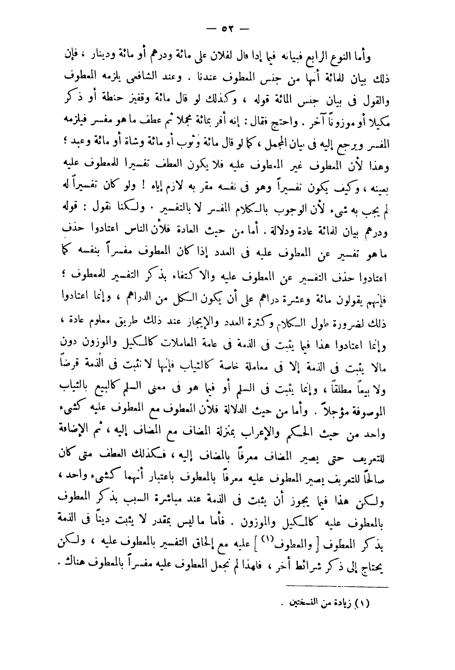 فَأَما مَا لَيْسَ بمقدر لَا يثبت دينا فِي الذِّمَّة بِذكر الْمَعْطُوف (والمعطوف) عَلَيْهِ مَعَ إِلْحَاق التَّفْسِير بالمعطوف عَلَيْهِ وَلَكِن يحْتَاج إِلَى ذكر شَرَائِط أخر فَلهَذَا لم نجْعَل الْمَعْطُوف عَلَيْهِ مُفَسرًا بالمعطوف هُنَاكَ